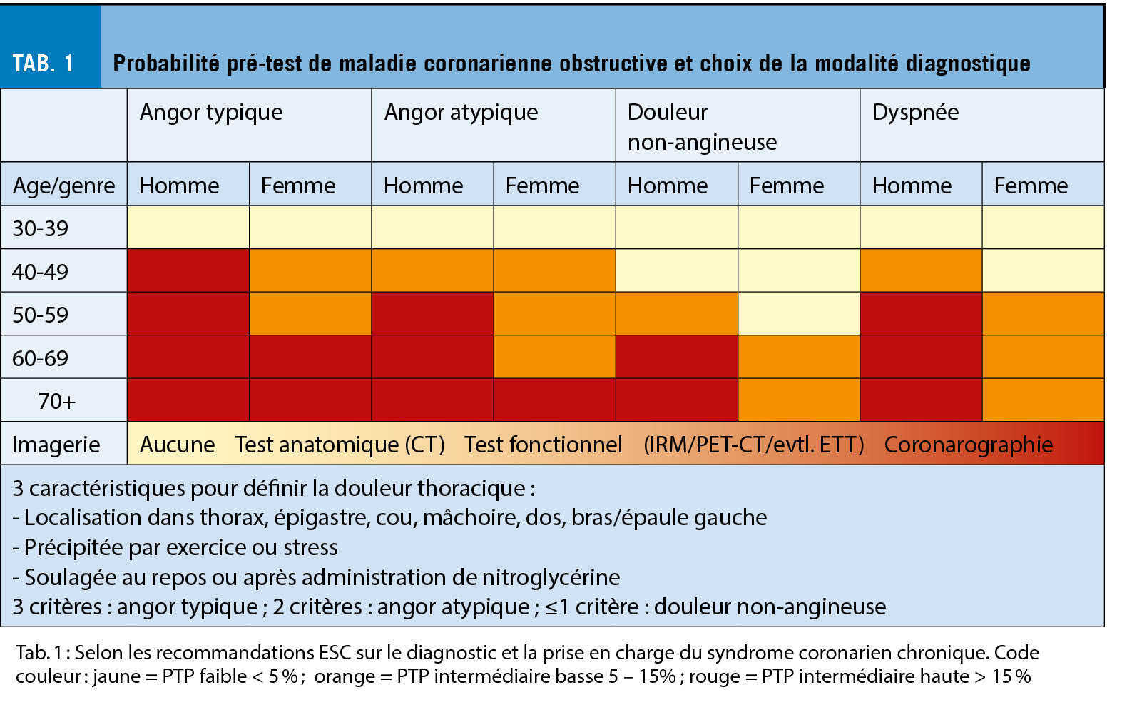 Les modèles de prédiction de la maladie coronarienne stable (MCS) obstructive ont été développés chez des personnes avec des douleurs thoraciques ou une dyspnée à l’ effort. De ce fait il est important d’ appliquer les outils de calcul de la probabilité pré-test (PPT) à ce groupe de patients. Malgré son ancienneté le diagramme de Diamond-Forrester (3) garde un rôle primordial dans l’ évaluation du risque et permet d’ orienter la prise en charge selon l’ âge, le sexe et le type de symptômes. Par contre, plusieurs études ont suggéré que la prévalence de la MCS obstructive était nettement plus basse qu’ initialement rapportée (4), raison pour laquelle les chiffres de la PPT ont été corrigés et le diagramme adapté (Diamond-Forrester modifié) (5). Le tableau 1 illustre la PPT et le choix de la modalité diagnostique proposée selon les recommandations de l’ ESC (1).