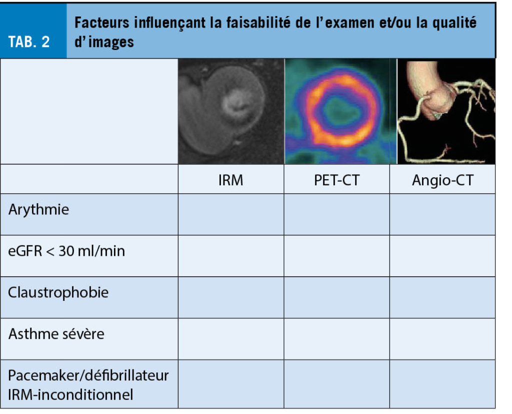 Afin de pouvoir choisir la modalité la plus adaptée à un patient, il est important de comprendre les caractéristiques des tests disponibles détaillées ci-dessous. Ces tests sont repartis en imagerie anatomique et fonctionnelle. Pour chaque examen il existe certaines contre-indications ou des situations qui risquent de diminuer la qualité de l’ examen et donc sa valeur diagnostique.