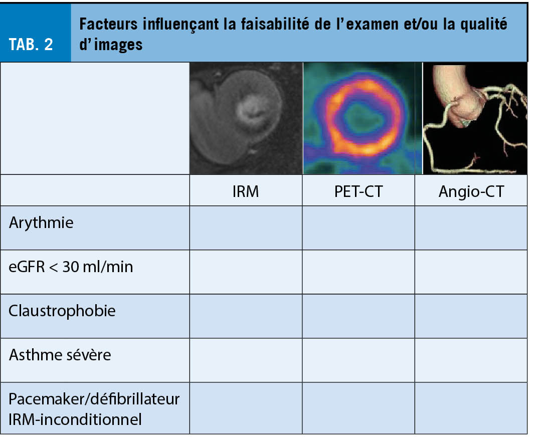 L’ imagerie fonctionnelle proprement dite a pour but de démontrer l’ ischémie myocardique en situation de stress pharmacologique ou physiologique. L’ IRM cardiaque et le PET-CT ont démontré la meilleure valeur prédictive en comparaison au gold standard de la coronarographie avec mesure par FFR. Ce n’ est pas surprenant puisque dans la cascade ischémique le défaut de perfusion survient avant l’ apparition de troubles de la cinétique segmentaire ou d’ anomalies à l’ ECG. Ces deux modalités prennent peu à peu la place des tests plus anciens (ergométrie, scintigraphie myocardique, échocardiographie de stress). Néanmoins l’ échocardiographie de stress garde une place importante parmi les cardiologues en raison de sa disponibilité et l’ apport diagnostique global sur la fonction et la structure du cœur de même que sur la capacité fonctionnelle du patient dans le cas d’ un effort physique. Pour permettre une valeur diagnostique suffisante dans la détection de la maladie coronarienne, l’ expertise de l’ opérateur et la sélection adéquate du patient sont indispensables. Toutefois, il n’ existe pas d’ étude comparant l’ ETT de stress à la mesure invasive de la FFR. La scintigraphie myocardique est à choisir seulement dans des cas où les autres modalités sont inaccessibles ou contre-indiquées car sa performance diagnostique est moindre, essentiellement due à la mauvaise résolution spatiale des images. Le choix de la modalité se fait premièrement en fonction de la PPT, mais aussi en prenant en compte les caractéristiques du patient donné (cf. figure 3), la disponibilité régionale et l’ expertise de chaque centre.