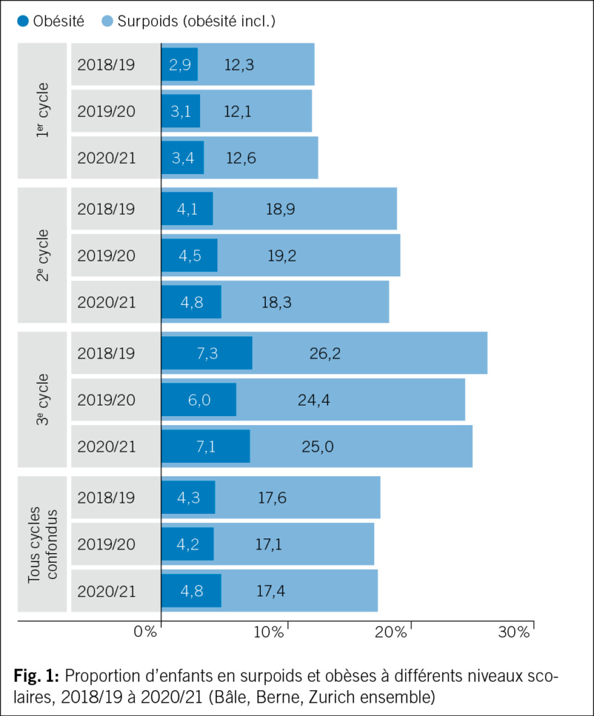 En Suisse, environ un écolier sur six est en surpoids ou obèse. Depuis l’ année 2005/06, Promotion Santé Suisse évalue les don- nées des services médicaux scolaires sur l’ indice de masse cor- porelle (IMC) des élèves des villes de Bâle, Berne et Zurich pour le monitoring annuel de l’ IMC. L’ analyse des données les plus récentes montre qu’ en 2020/21, tous niveaux scolaires confondus, 17.4 % des élèves étaient en surpoids, dont 4.8 % obèses d’ après l’ IMC. La comparaison avec les années précédentes montre toutefois que la proportion d’ écoliers en surpoids reste stable ces dernières années.