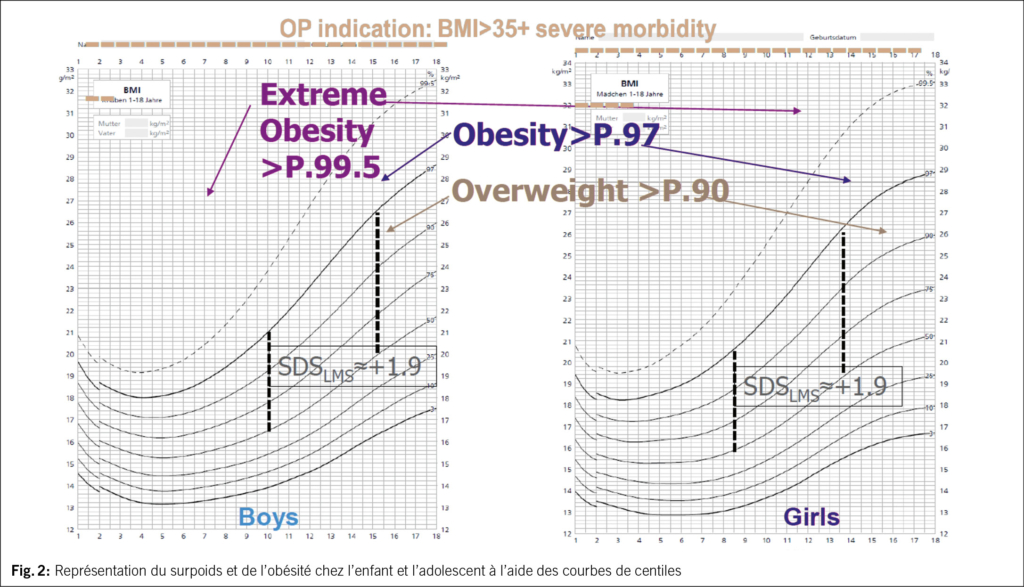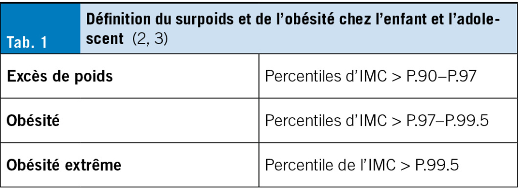 On parle d’ obésité lorsque la proportion de graisse corporelle par rapport à la masse corporelle totale est pathologiquement élevée. L’ IMC, défini comme le quotient du poids corporel mesuré en kg et le carré de la taille mesurée en m, constitue une mesure indirecte acceptable de la masse grasse corporelle totale. Il est également recommandé chez les enfants pour définir le sur- poids et l’ obésité. Contrairement aux adultes, pour lesquels la définition épidémiologique du surpoids et de l’ obésité est déter- minée par des seuils fixes indiquant chacun un risque accru pour la santé (obésité: IMC > 30 kg/m2, surpoids: IMC > 25 kg/m2), les seuils pour les enfants et les adolescents dépendent de l’ âge en raison de leur développement physique. Il y a surpoids lorsque l’ IMC est supérieur au 90e percentile spécifique à l’ âge et au sexe ; l’ obésité chez l’ enfant et l’ adolescent est défi- nie par un IMC supérieur au 97e percentile. En Suisse, on utilise les courbes de référence allemandes de Kromeyer-Hauschild (2) pour définir l’ obésité chez l’ enfant et l’ adolescent. (Tab. 1) (Fig. 2)