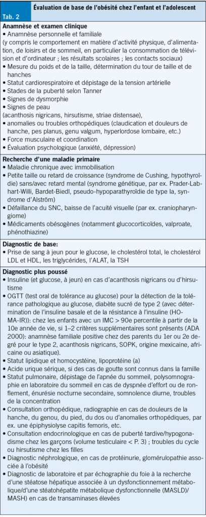Les indications pour le diagnostic et le traitement se prennent de manière échelonnée en fonction de l’ ampleur et de l’ évolution de l’ obésité et des risques anamnestiques. Un examen médical approfondi et une prise de sang pour un bilan de laboratoire sont indiqués pour tous les enfants dont l’ IMC est supérieur à P. 97. En cas de surpoids (IMC > P. 90 < P. 97), un diagnostic médical est conseillé si l’ anamnèse familiale chez des parents du 1er ou du 2e degré est positive pour l’ obésité ou les maladies associées (diabète de type 2, maladies athéro-scléreuses précoces, hypertension artérielle, hypercholestérolémie), s’ il existe une comorbidité liée au poids et/ou si des facteurs de risque tels qu’ une augmentation du cholestérol total, du glucose ou de la tension artérielle, entre autres, sont connus chez l’ enfant. Mais aussi en cas d’ augmentation particulièrement forte de l’ IMC (p. ex. > 3 kg/m2 par an), il convient de procéder à un examen complet des facteurs de risque cardio-métaboliques ou des comorbidités associées au poids (Tab. 2) (15).