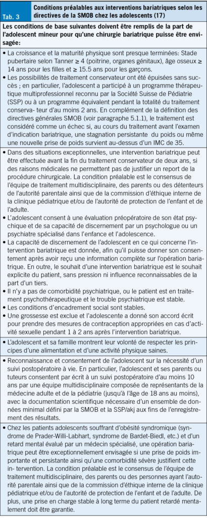 Les traitements conservateurs (interventions sur le mode de vie), sont les traitements de premier choix. Ils doivent être menés de manière multimodale et structurée. Toutefois, lorsque les possibilités de traitement conservateur ont été utilisées sans succès pendant plus de 2 ans, les procédures chirurgicales représentent de plus en plus une option thérapeutique efficace, même pour les adolescents souffrant d’ obésité morbide. Il convient de souligner que les procédures chirurgicales bariatriques n’ agissent pas par une restriction mécanique de l’ apport alimentaire et une diminution de l’ absorption des macronutriments, mais par des mécanismes d’ action neuroendocriniens complexes qui influencent la régulation de la faim et de l’ appétit. L’ analyse de l’ indication pour une opération bariatrique doit être effectuée selon les directives pour le traitement chirurgical de l’ obésité de la SMOB dans un centre de référence bariatrique reconnu par la SMOB (www.smob.ch) en collaboration avec un centre de référence pour l’ obésité pédiatrique certifié (Tab. 3).