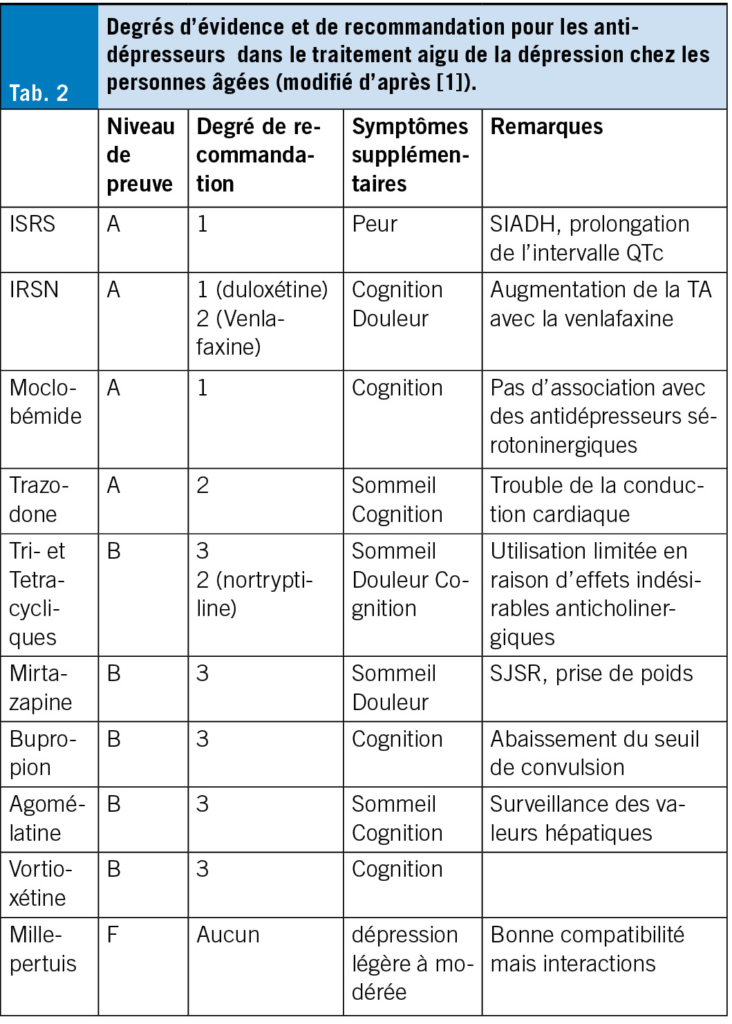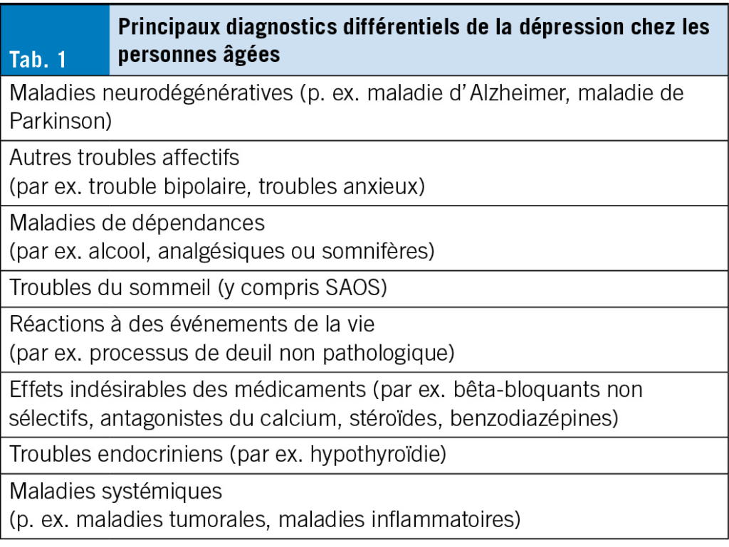 Il n’ est pas rare de trouver chez les patients âgés des tableaux mixtes complexes de multimorbidité et de handicaps quotidiens, de facteurs de stress psychologiques et sociaux (p. ex. perte d’ un être cher et isolement). Il peut être difficile de distinguer les causes des conséquences et les comorbidités des complications. Les recommandations suisses pour le diagnostic et le traitement de la DPA fournissent des informations complémentaires sur l’ interaction entre la DPA et, entre autres, la démence, le sommeil, la douleur et des comorbidités somatiques importantes (1). Les pathologies s’ accompagnant de symptômes similaires à ceux de la dépression doivent faire l’ objet d’ un diagnostic différentiel (tableau 1). Il convient de mentionner en particulier l’ effet dépressif possible de nombreux médicaments (5).