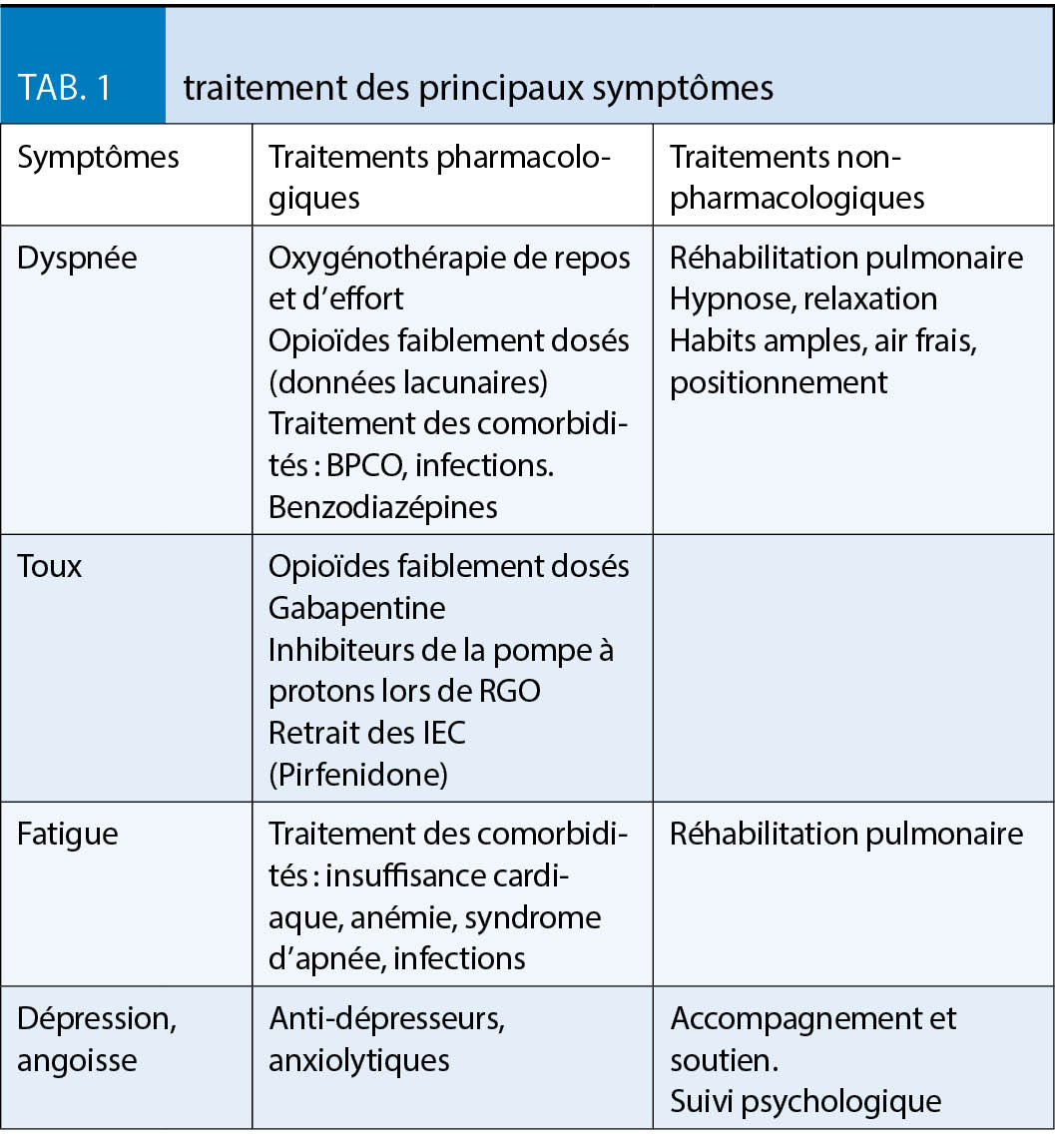 La gestion des symptômes, dyspnée, toux, fatigue, dépression et anxiété, qui ne doit pas être négligée dans la prise en charge de la FPI, est résumée dans le tableau 1 (10). La plupart des traitements symptomatiques proposés le sont cependant avec un faible niveau d’ évidence.