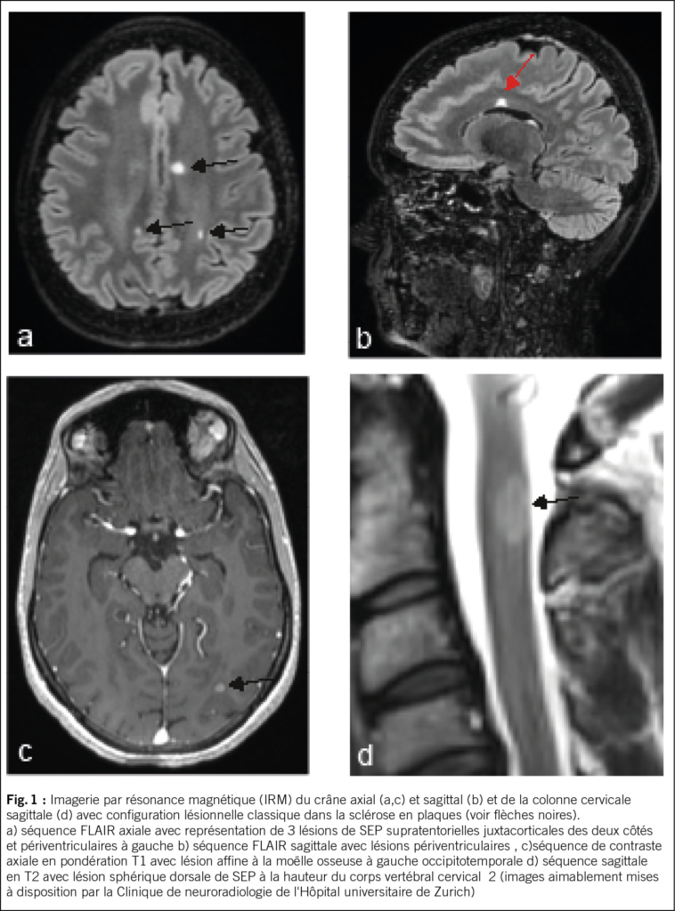 Dans un premier temps, après une anamnèse détaillée et un examen clinique neurologique, il convient, si la suspicion persiste, de procéder à une IRM avec produit de contraste du crâne ou, selon les symptômes, de la moelle épinière, en posant la question des modifications inflammatoires chroniques. Les quatre localisations classiques des lésions de SEP, généralement ovales, aux limites relativement nettes, puis confluentes, sont juxtacorticales, périventriculaires, infratentorielles et spinales (voir figure 1). Les lésions inflammatoires actives se distinguent par leur prise de contraste (4).