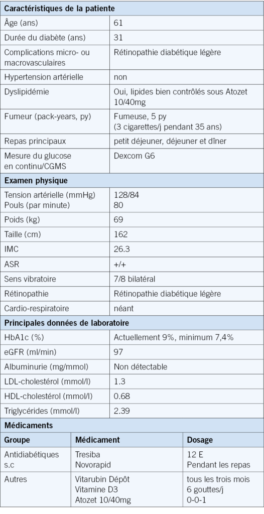 Chez une patiente de 61 ans, un diabète sucré de type 1 est connu depuis l’âge de 30 ans. De plus, elle présente dans son anamnèse personnelle une maladie de Basedow et une anémie pernicieuse et remplit donc les critères d’un syndrome polyendocrinien auto-immun. Le diabète est traité par une insuline basale (Tresiba, 12 U par jour) et du Novorapid pendant les repas (cumul d’environ 26 U par jour). Le contrôle de la glycémie est toutefois insuffisant depuis de nombreuses années (HbA1c 7,5-9%). Depuis 10/18, la patiente utilise un système de surveillance du glucose en continu (Dexcom). Elle a ainsi pu réduire sa peur des hypoglycémies. Cependant, en raison de cette peur, elle n’applique pas de manière fiable l’écart entre l’injection et le repas. En d’autres termes, l’insuline rapide est injectée au moment du repas et non 15 à 30 minutes avant celui-ci.