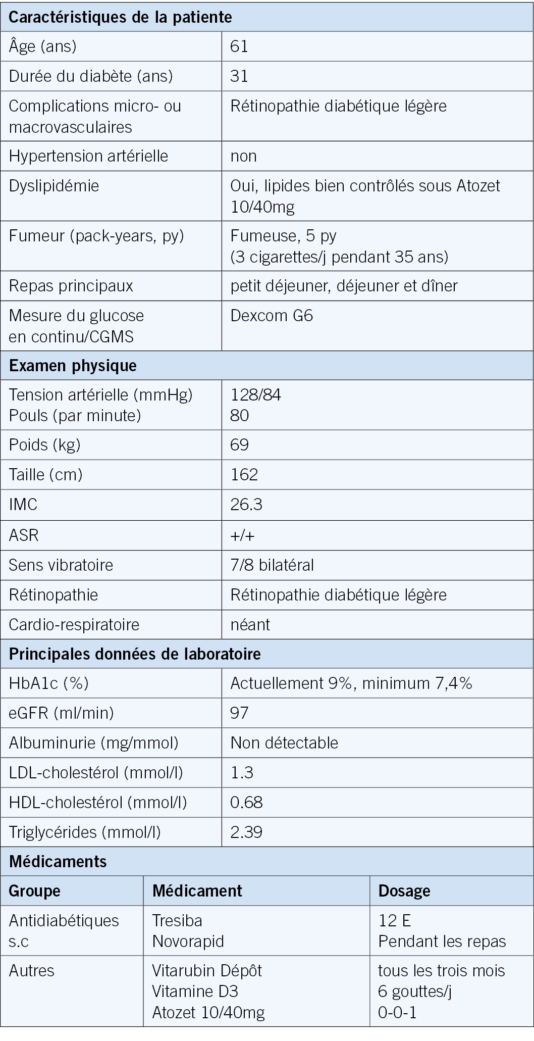 La patiente souffre, dans le cadre du syndrome polyendocrinien auto-immun, d’un diabète sucré de type 1 (DI 1991), de la maladie de Basedow (depuis 1998) et d’une anémie pernicieuse (DI 2009). Elle présente en outre une dyslipidémie, qui est bien contrôlée par des médicaments.