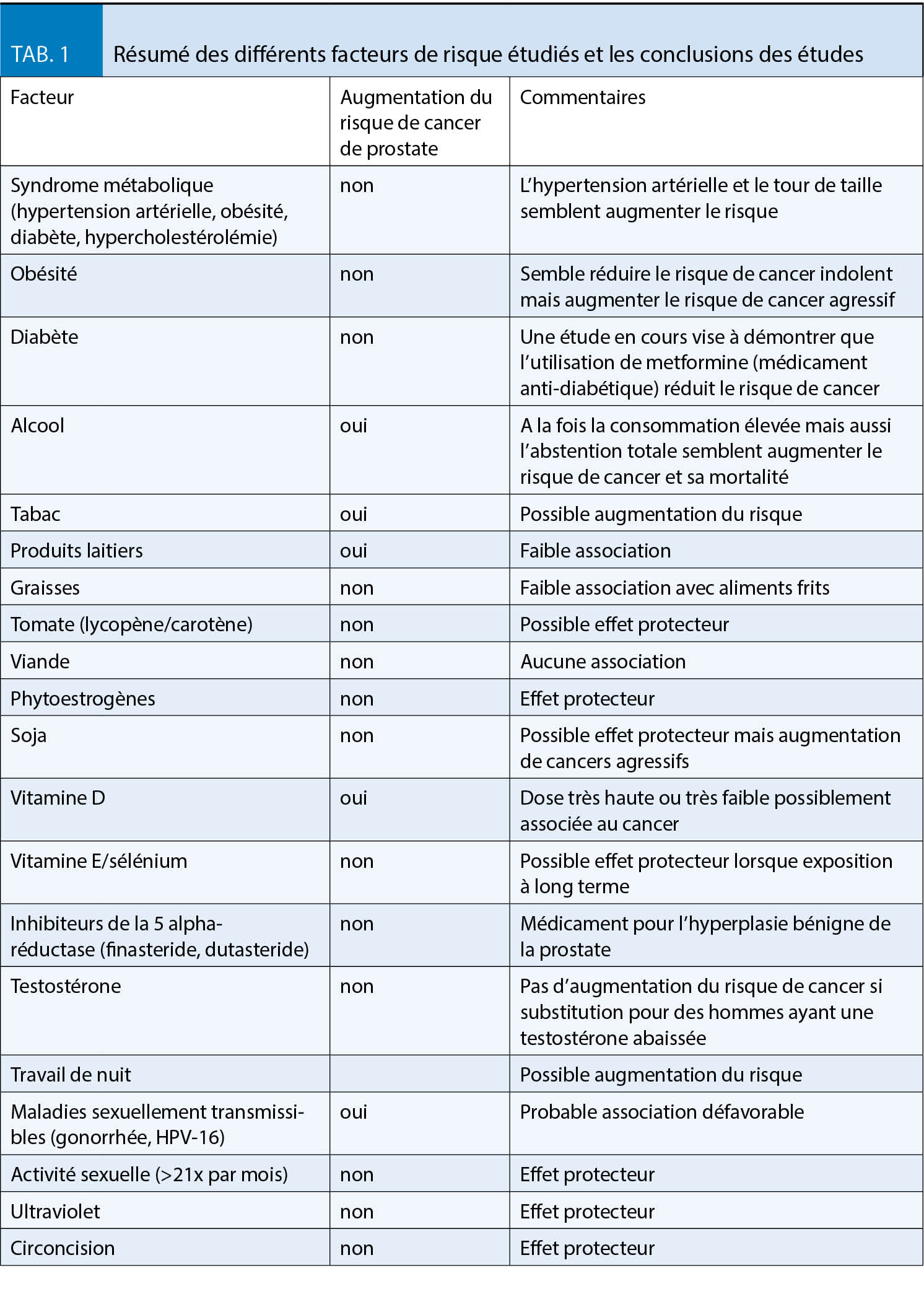 Il existe clairement une prédisposition génétique puisqu’ un homme dont le père a présenté un cancer de la prostate a deux fois plus de risque de développer un cancer qu’ un homme sans histoire familiale de cancer. Si le père et un frère ont été diagnostiqués, ce risque est cinq fois supérieur à la population sans histoire familiale. Si le père et deux frères ont présenté un cancer de prostate, le risque est dix fois supérieur (5, 6). Les hommes d’ Afrique ou de descendance africaine sont plus à risque de développer un cancer de la prostate, souvent aussi à un âge plus jeune et de progression plus agressive (7). Les études génétiques ont identifié plus d’ une centaine de gènes (par exemple GSTP1, TMPRSS2, HOXB13, BRCA1/2) jouant un rôle probable dans la survenue du cancer de la prostate (8). Suite à l’ observation d’ une augmentation du risque de cancer de prostate chez les émigrés japonais (faible risque de cancer de prostate) vivant aux Etats-Unis (9), une multitude de facteurs diététiques et environnementaux ont été suspectés. Toutefois, à ce jour, aucun facteur n’ est clairement établi. Le tableau 1 ci-dessous résume les différents facteurs de risque étudiés et les conclusions des études (10). Toutefois, ces études peinent à établir tout lien de causalité. De ce fait, aucune stratégie préventive n’ est recommandée.