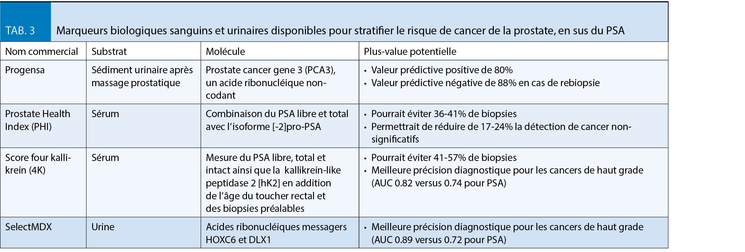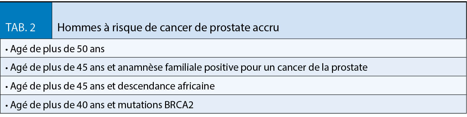 - La mise à jour de l’ étude ERSPC avec un suivi à 16 ans montre des « number needed to screen » et « number needed to treat » intéressants, de 570 et 18 patients, respectivement (14), en dessous des mêmes indices pour le cancer du sein. Sur la base de ces observations, l’ European Association of Urology recommande un dépistage individualisé chez des patients informés à risque de cancer de la prostate (tab. 2) ayant une espérance de vie de >10-15 ans (15). Bien qu’ une multitude d’ autres marqueurs biologiques (sanguins et urinaires, tab. 3) soient disponibles, aucun n’ a pour l’ instant surpassé le PSA en pratique courante (15). Néanmoins, ces derniers permettent souvent une meilleure stratification du risque et pourraient éviter un certain nombre de biopsies (16).