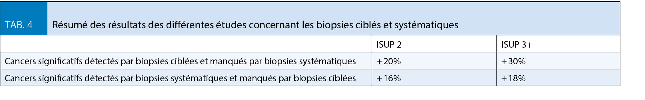 Au cours des 10 dernières années, l’ IRM multiparamétrique de la prostate s’ est progressivement imposée comme un outil de stratification du risque et d’ aide au diagnostic. Elle permet de diagnostiquer et localiser plus de cancers significatifs (ISUP grade ≥2) et moins de cancer non-significatifs (ISUP grade 1 ou cancer de <5mm) (17). Ainsi, le schéma toucher rectal – PSA – biopsies transrectales systématiques (12 biopsies permettant l’ échantillonnage des 6 régions prostatiques) a été modifié par l’ IRM (fig. 1). Avec une sensibilité de plus de 90% pour la détection des cancers significatifs, la question se pose de savoir si les biopsies ciblés (généralement 1-3 biopsies dans la lésion cible visualisée par l’ IRM) seules pourraient être entreprises, en omettant les biopsies systématiques. Le tableau 4 résume les résultats des différentes études (15). Au final, pour l’ instant en pratique courante, les biopsies systématiques et ciblées sont réalisées en complémentarité.