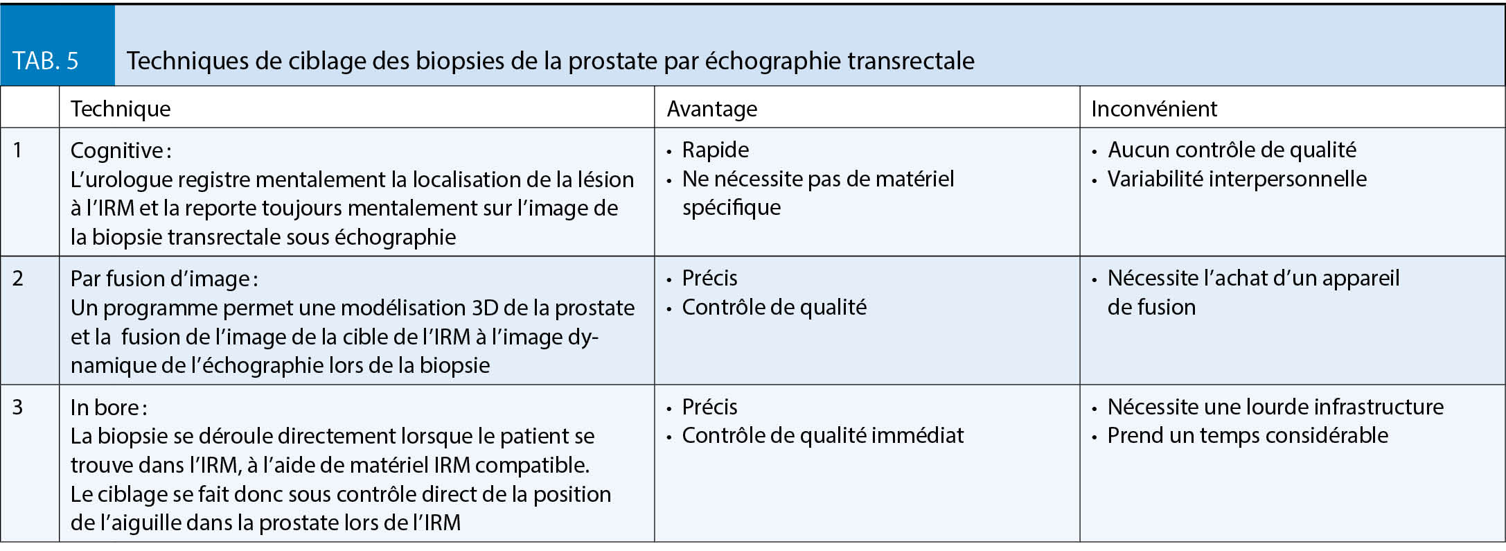 L’ IRM représente donc un outil puissant permettant d’ améliorer la précision du diagnostic et permet une meilleure stratification du risque. Toutefois, la variabilité inter-observateurs n’ est pas encore résolue et limite donc son utilisation à des centres experts. De plus, la méthode de ciblage (tab. 5) peut faire défaut et ainsi aboutir à une biopsie faussement négative.