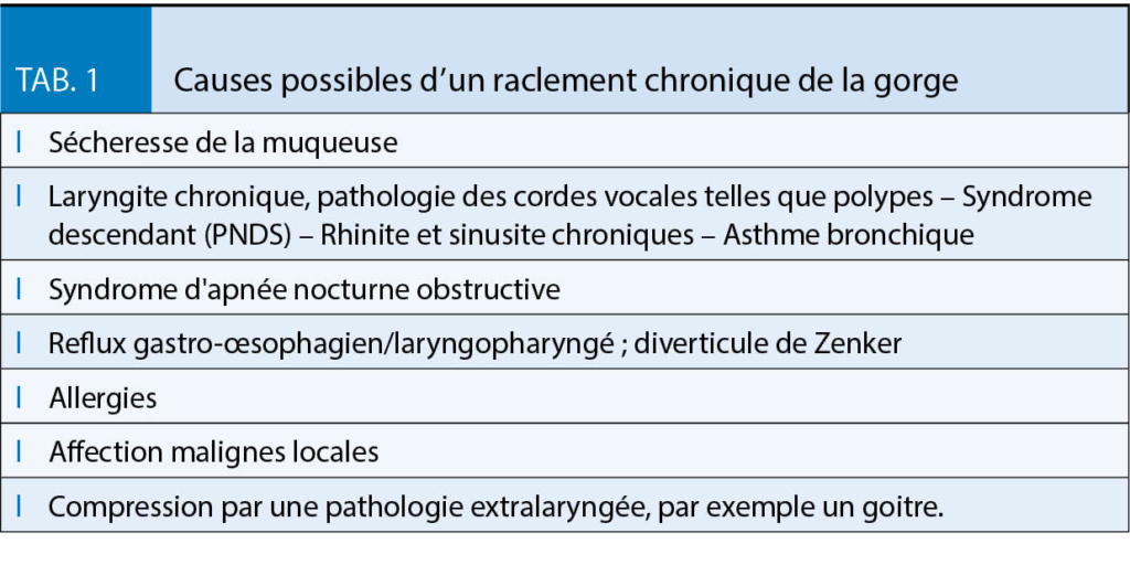 Au centre de la physiopathologie se trouve une muqueuse laryngée trop sèche. Chaque jour, environ 1,5 l de mucus se forme physiologiquement dans les voies respiratoires supérieures et les voies d’ alimentation. Ce mucus forme un film fin sur la muqueuse qui, en plus de son effet protecteur, assure également la capacité de glissement de la muqueuse pendant la déglutition. Si trop peu de mucus se forme, sa viscosité augmente. Le film de mucus devient épais et adhère à la muqueuse, ce qui provoque la sensation de corps étrangers et la contrainte d’ éclaircir la gorge. Par ce mécanisme du mucus épaissi et plus ou moins incolore, peut être expulsé. Une surproduction de mucus peut également provoquer les symptômes, car ce mucus peut également irriter localement en tant que « corps étranger » et doit être évacué. En plus des modifications laryngées locales, les maladies inflammatoires et non inflammatoires des organes voisins (amygdales, nez, sinus paranasaux, reflux gastro-œsophagien, diverticule de Zenker, syndrome d’ apnée nocturne) doivent être considérées comme une possible étiologie possible. L’ une des causes les plus fréquentes d’ un raclement de gorge chronique est le « syndrome descendant » ou « Post-nasal Drip Syndrom » (PNDS) dans lequel une sensation persistante de corps étranger se développe dans la gorge en raison du mucus particulièrement visqueux. Le PNDS survient souvent pendant ou après une infection virale des voies respiratoires supérieures. Une inflammation permanente des voies respiratoires, comme dans l’ asthme bronchique, peut entraîner une hypersensibilité et un gonflement des muqueuses ainsi qu’ une une surproduction de mucus qui entraîne fréquemment un raclement de gorge et une toux chronique, une respiration sifflante, voire une image obstructive avec expiration prolongée et, dans les cas plus prononcés, une dyspnée et une oppression thoracique. D’ autres causes possibles de raclement chronique de la gorge comprennent le reflux gastro-œsophagien ou laryngo-pharyngé, dans lequel la muqueuse bronchique est irrité par l’ acidité gastrique refluant à travers la glotte, des allergies ou des pathologies avec compression du larynx, par exemple un goitre. Un résumé des différentes causes est présenté dans le tableau 1. 40 % de tous les patients atteints de toux chronique ou forcée souffrent de PNDS, d’ une maladie de reflux ou d’ un asthme bronchique, ou alors d’ une combinaison de différentes pathologies, qui peuvent avoir été asymptomatiques en elles-mêmes, mais qui ensemble entraînent une irritation laryngée chronique importante. Ces symptômes peuvent être favorisés par une atmosphère trop sèche, une hydratation insuffisante, l’ ingestion de substances nocives telles que la nicotine, l’ alcool, certains produits chimiques, la poussière, certains médicaments et une respiration par la bouche en cas d’ obstruction nasale.