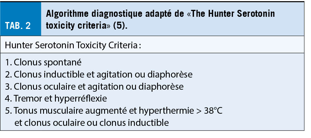 Il repose sur une triade de symptômes neuropsychiatriques (agitation, nervosité, insomnie, hypomanie et, pour les formes graves, confusion, troubles de la vigilance), de symptômes neurovégétatifs (fièvre, diaphorèse, tachycardie, tachypnée, diarrhée, hypertension artérielle et mydriase) et de troubles neuromusculaires souvent plus marqués aux membres inférieurs (tremblements, hyperréflexie, myoclonies, clonus, rigidité). Comme il s’ agit d’ un tableau protéiforme et qu’ il n’ existe pas de symptomatologie spécifique du SS, certains auteurs parlent plus volontiers de toxicité sérotoninergique. L’ algorithme diagnostique de Dunkley et al. pour identifier un SS est simple d’ utilisation, sensible (84%) et spécifique (97%). Il met l’ accent sur l’ introduction récente d’ un traitement sérotoninergique, une augmentation des doses ou une co-prescription à risque (tableau 2) (5).