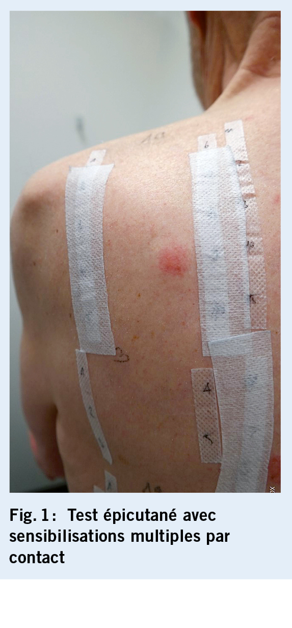 Cliniquement, on observe un érythème périanal avec des lésions éparses, avec des bords indistincts (fig. 2). Des hemorroïdes ou d’ autres affections proctologiques ont déjà été exclues par les collègues de la gastro-entérologie. Comme une sensibilisation de contact semblait possible sur la base de l’ anamnèse, un examen épicutané a été effectué.