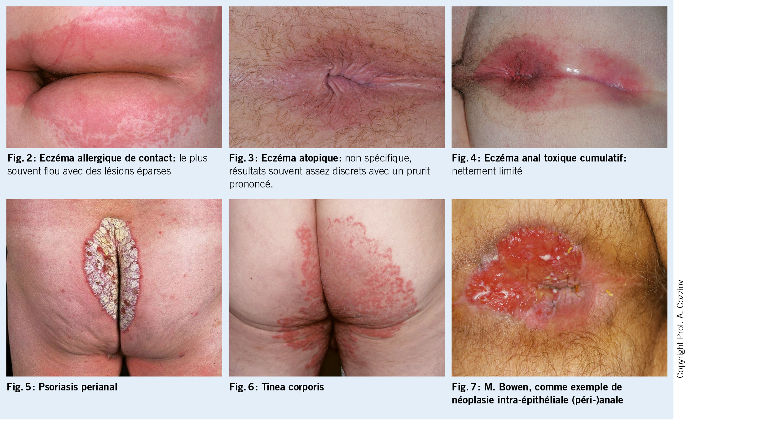 Une anamnèse détaillée est essentielle afin d’ identifier la cause de l’ eczéma anal. En plus de la date de l’ apparition et l’ évolution de l’ eczéma il faut rechercher les symptômes principaux tels que des démangeaisons, des brûlures, des suintements et des douleurs. L’ anamnèse doit examiner la possibilité d’ une éventuelle diathèse atopique et le type d’ hygiène anale (excessive/insuffisante). En outre, l’ anamnèse doit chercher des troubles proctologiques (hémorroïdes, fistules anales, etc.), et adresser le comportement sexuel (rapports anaux, lubrifiants, utilisation de préservatifs), les maladies sexuellement transmissibles dans les antécédents personnels et pour les personnes âgées de plus de 50 ans, une coloscopie antérieure. L’ examen standard comprend l’ inspection et le toucher rectal, qui sont faciles à réaliser dans le cabinet du médecin généraliste. L’ inspection doit idéalement porter sur l’ ensemble du tégument. Ainsi, dans le cas du psoriasis, par exemple en plus des points de prédilection typiques sur les côtés extenseurs des extrémités (coude, genou) ou sur l’ os du sacrum, des modifications cutanées typiques sont également fréquemment observées dans la région anogénitale (fig. 5). Un frottis, par exemple pour détecter une dermatite streptococcique périanale, peut contribuer à clarifier la situation. Le prélèvement d’ un échantillon dans le cas de tinea corporis (fig. 6) ou de candidose doit être effectuée en cas de doute.