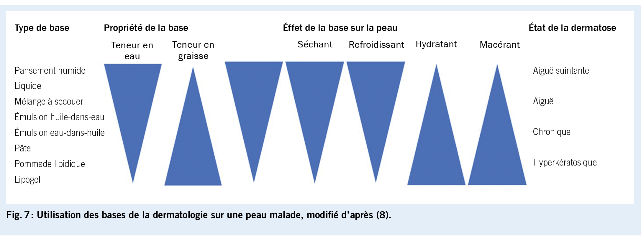 Le traitement topique dépend de l’ étiologie sous-jacente et de la morphologie de la dermatose (fig. 8). En cas de lésions cutanées aiguës suintantes ou de transpiration abondante dans la région anale, des astringents peuvent être appliqués sous la forme de bains de siège (Tannosynt liquide, 1-2x/jour). Les tanins contenus dans le thé noir ont également un effet asséchant et peuvent être appliquées sous forme de compresses humides. En outre, les préparations à base de zinc, anti-inflammatoires et le plus souvent sans allergènes, favorisent la cicatrisation des plaies. Les topiques avec différents contenus en eau et en graisses sont disponibles (pâte pour plaies d’ oxyplastine, pâte ZinCream Medinova), qui peuvent être appliqués plusieurs fois par jour. Si l’ on soupçonne un eczéma de contact, il faut appliquer, si possible, notamment avant les tests épicutanés, uniquement des topiques sans allergènes, tels que la formulation de base d’ huile dans de l’ eau Unguentum emulsificans aquosum (formulation magistrale Ung. Emulsificans, p.ex. 30 ad Aqua 100) ou de la vaseline blanche. Comme thérapie anti-inflammatoire pour tous les eczémas (péri-)anaux, mais surtout l’ eczéma atopique, les stéroïdes de classe II sont utilisés à court terme. L’ application 1x/jour ne doit pas dépasser une période de 2 à 3 semaines (diminution progressive) (hydrocortisone, p.ex. Locoid émulsion fluide ou crème 0.1%) (4).