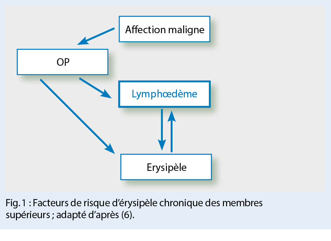 Une barrière cutanée perturbée, comme dans la dermatite de stase, une onychomycose et la dermatomyosite, peut constituer un point d’ entrée pour une récidive de l’ érysipèle. Les lésions facilitent l’ invasion bactérienne des tissus (3). Le facteur prédictif le plus important de récidive de l’ érysipèle est la présence d’ un lymphœdème chronique (1). Des érysipèles à répétition entraînent des lésions progressives et irréversibles des vaisseaux lymphatiques. L’ œdème riche en sérum qui en résulte constitue donc un risque supplémentaire de récidive. Les troubles du flux lymphatique peuvent aussi être causés par des lésions des vaisseaux lymphatiques dues à des infections, une radiothérapie et des interventions chirurgicales. Ces dernières comprennent, par exemple, la lymphadénectomie en cas de maladie tumorale et la saphénectomie en cas de pontage. En outre, la neuropathie chez les diabétiques, l’ insuffisance veineuse chronique et l’ obésité sont également des facteurs de risque. En particulier, le diabète sucré est considéré comme un facteur favorisant la fasciite nécrosante (4). Très rarement, des immunodéficiences primaires peuvent contribuer à la pathogenèse de l’ érysipèle récurrent. En fin de compte, le lymphœdème reste le facteur déterminant pour le développement d’ un érysipèle récurrent (fig. 1).