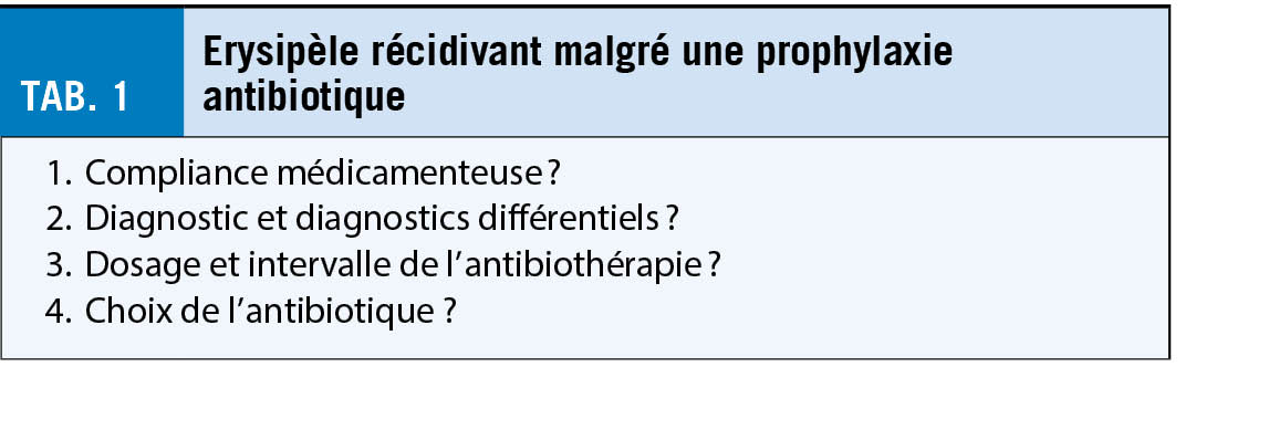 Une raison courante et quotidienne de la récidive est une compliance médicamenteuse insuffisante. Des effets secondaires indésirables ainsi que l’ ’utilisation incorrecte ou manquante de l’ antibioprophylaxie figurent parmi les raisons les plus fréquentes de la récidive de l’érysipèle (tab. 1).