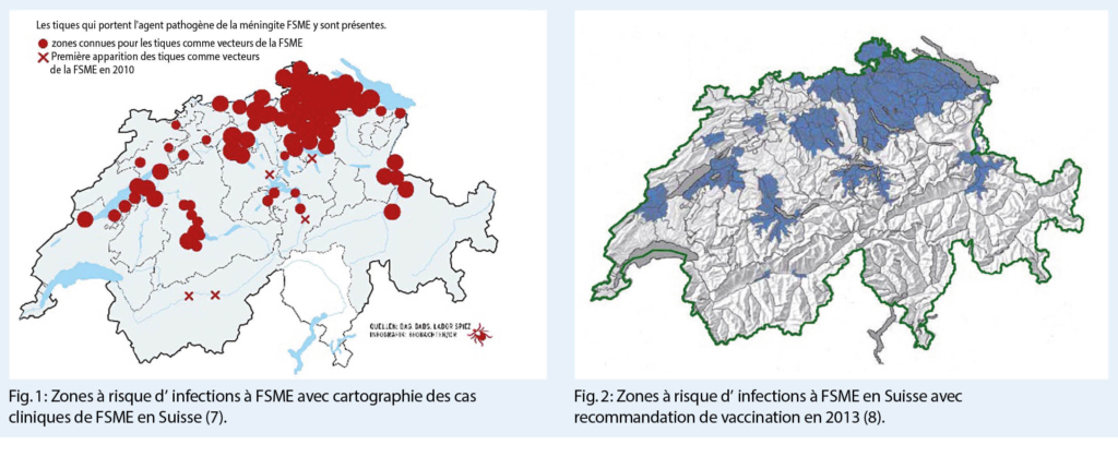Les zones cartographiées où la vaccination contre la FSME est recommandée ne prennent en compte que les cas cliniques. Cette approche médicale présente deux lacunes majeures. Premièrement, la méthode de prendre les cantons comme entité la plus petite pour identifier des foyers naturels de très petite taille est insuffisante. Les foyers naturels sont aussi grands qu’ un demi-terrain de football et ne peuvent être identifiés qu’ à l’ issue de recherches approfondies sur le terrain (12) (13). Deuxièmement, pour le virus FSME, l’ homme est un hôte sans issue qui ne joue aucun rôle dans la propagation du virus. L’ enregistrement des seuls cas humains de FSME donne une image déformée de la propagation spatiale de la FSME (2).