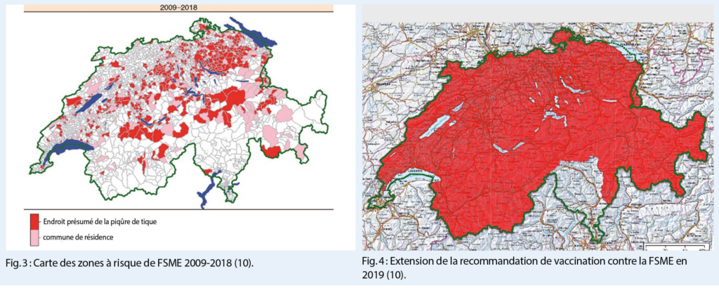 La figure 3 montre l’ expansion spatiale des zones à risque de FSME entre 2009 et 2018 avec les sites où l’ on soupçonne des piqûres de tiques (rouge) et, si cette information fait défaut, la commune de résidence (rose) des personnes atteintes de FSME. La figure 4 présente les zones pour lesquelles la recommandation de vaccination contre la FSME est en vigueur depuis février 2019 (10) comme résultat de la gestion pragmatique, par la politique de santé, du nombre croissant des cas de FSME. La vaccination protège contre l’ infection à FSME, mais pas contre la maladie de Lyme. L’ expérience de plus de 40 exposés sur la prévention montre que plus de la moitié du public intéressé ne connaît pas cette distinction (11). La conclusion inverse signifie qu’ une grande partie de la population interprète mal la carte des zones à risque de FSME et estime qu’ il n’ y a aucun risque de tiques en dehors des zones rouges. L’ une des raisons pourrait être l’ utilisation imprécise du terme « vaccination contre les tiques » pour désigner la protection vaccinale contre la FSME.