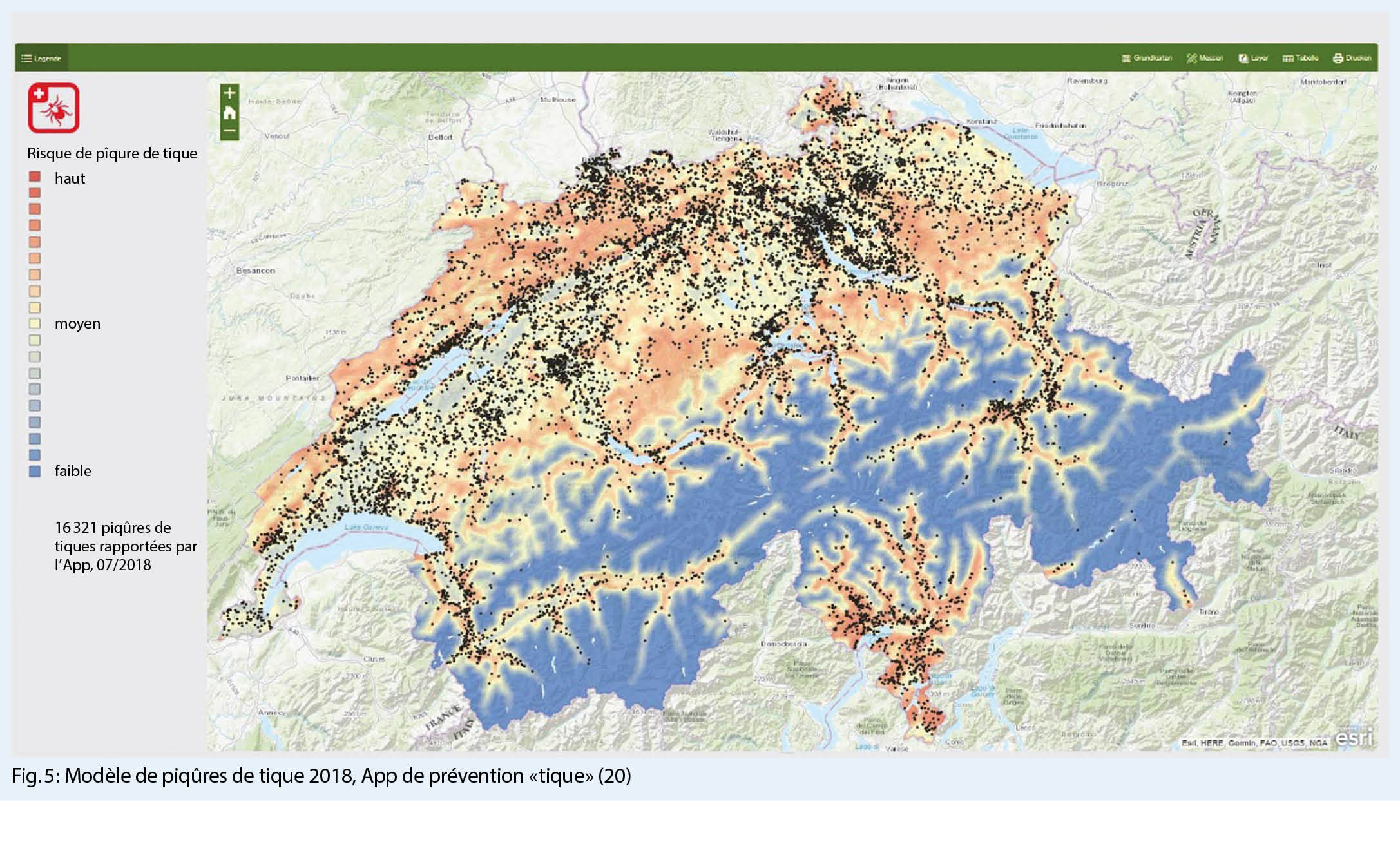 Le projet de recherche de la ZHAW, « Fighting bites with bytes », utilise ces points de données pour développer un modèle dynamique du risque potentiel associé aux tiques (22). Les premiers résultats sont attendus au début de l’ été 2020.