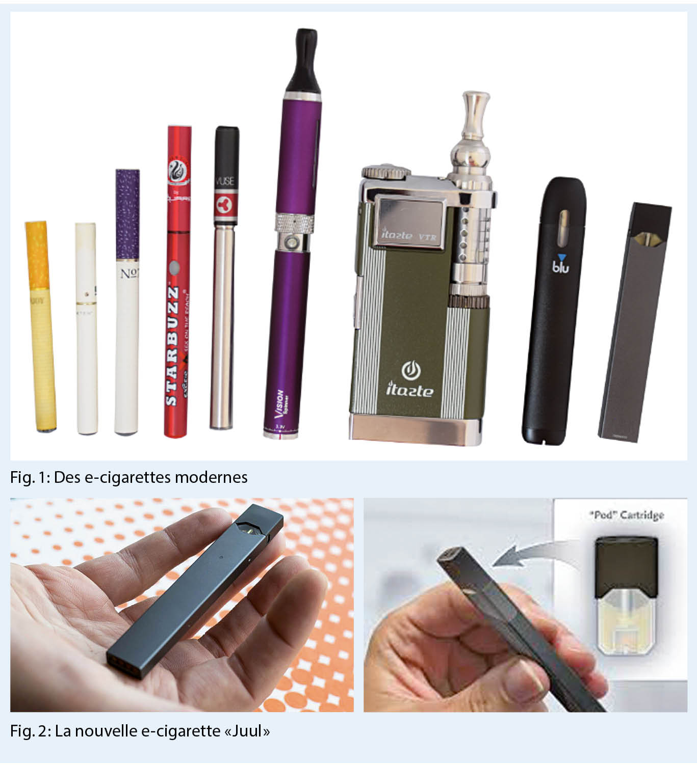 Il y a quelques années, la nouvelle e-cigarette « Juul » a été lancée aux Etats-Unis, qui, par son aspect très tendance de clé USB (fig. 2) et utilisant une nouvelle forme de nicotine très concentrée et liée au sel, s’ est rapidement répandue parmi les adolescents américains. Aux États-Unis, des concentrations de nicotine allant jusqu’ à 50 mg/ml sont disponibles dans le commerce, en Europe, seules 20 mg/ml sont autorisées. Déjà deux tiers des jeunes fumeurs d’ e-cigarettes aux USA utilisent le « Juul » : on ne parle plus de « vapoter » mais de « juuler ». L’ entreprise américaine – la start-up à la croissance la plus rapide de l’ histoire des entreprises – est maintenant sur le point de conquérir le marché européen avec « Juul » (22). Aux États-Unis, les jeunes sont déjà plus nombreux à « fumer » des e-cigarettes qu’ à fumer des cigarettes, et la prévalence est en constante augmentation : en 2018, elle était de 25 % chez les 17-18 ans et de 20 % chez les 15-16 ans (23, 24).