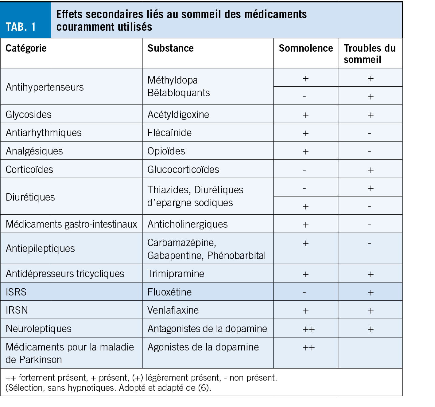 L’ anamnèse du sommeil est complétée par le recueil des antécédents médicaux (maladies chroniques, douleurs). De nombreux médicaments perturbent le sommeil ou sont sédatifs et peuvent ainsi provoquer une somnolence diurne (tab. 1). En outre, les valeurs des fonctions hépatiques et rénales, les paramètres du bilan martial, y compris la ferritine, la vitamine D, la tension artérielle, le TSH, le poids et la taille du corps doivent être déterminés. Un examen rapide de la gorge donne une indication de l’ étroitesse des voies aériennes supérieures. Ceci, associé à un tour de cou important rend la présence de troubles respiratoires liés au sommeil plus probable (4, 5).