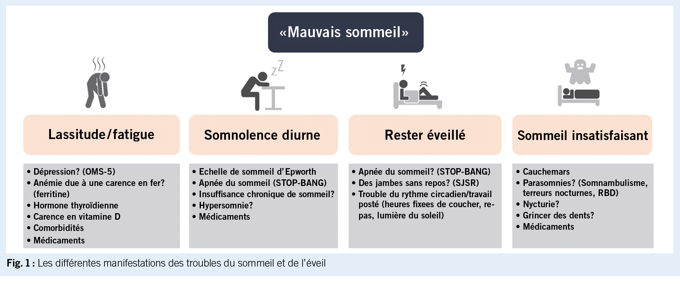 Tout d’ abord, il est important de clarifier les termes avec le patient : la fatigue diurne décrit une fatigue mentale et physique précoce, tandis que la somnolence diurne décrit une forte tendance à s’ endormir à des moments inappropriés. Les causes des troubles du sommeil sont multiples et requièrent une approche systématique afin de pouvoir établir un diagnostic et d’ initier un traitement adapté (fig. 1).