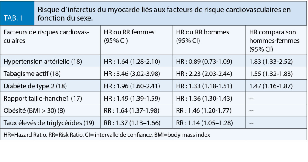 L’ impact selon le sexe des FRCV est représenté dans le Tableau 1. Chez les femmes, l’ hypertension artérielle, le tabagisme, l’ hypertriglycéridémie ainsi que le diabète de type 2 (DM2) sont associés à des risques plus élevés d’ IM par rapport aux hommes (18).