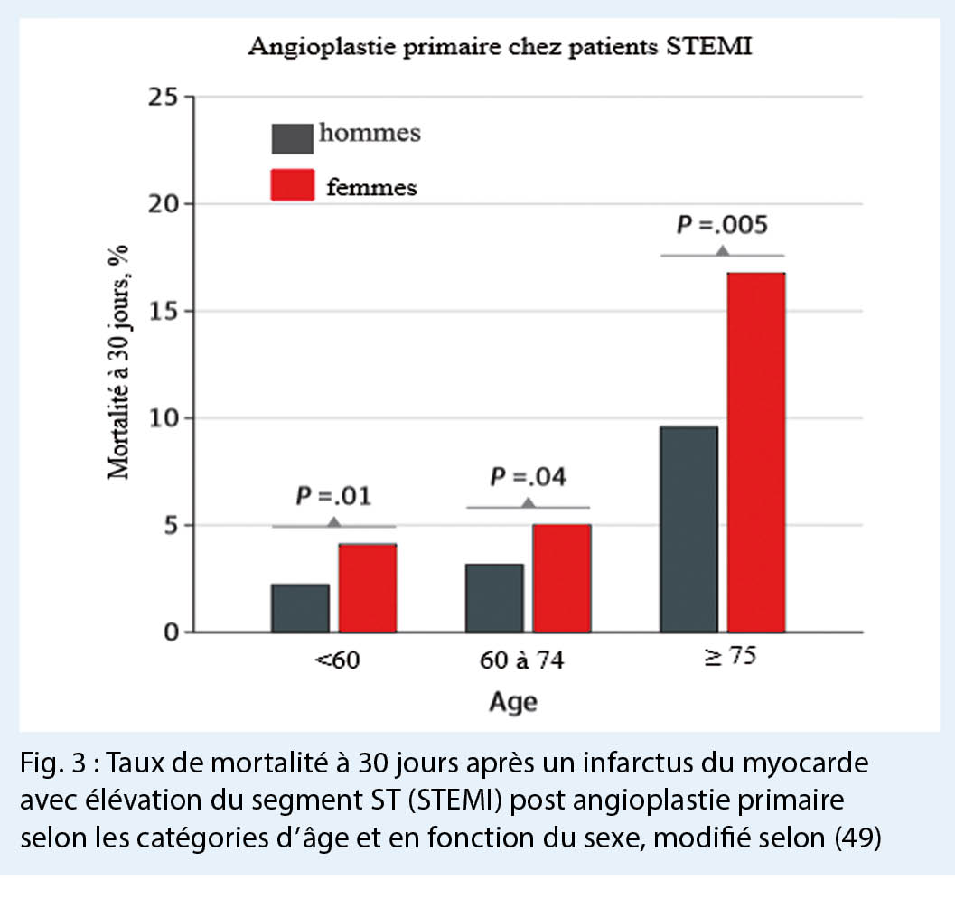 Selon une étude de cohorte rétrospective entre 1992 et 1993, les femmes de moins de 75 ans ont présenté un taux de mortalité deux fois plus élevé que les hommes du même groupe d’ âge après un IM (48). Une étude récente a examiné une population internationale européenne entre 2010 et 2016 (49). Les résultats étaient similaires ; la mortalité était plus élevée à 30 jours après un IM avec élévation du segment ST (STEMI) chez les femmes de moins de 60 ans. La différence n’ était plus significative pour les patientes plus âgées. Lors d’ un STEMI, la mortalité diminuait chez les deux sexes après une angioplastie coronarienne, mais la mortalité restait néanmoins plus élevée chez les femmes, avec 30 % de plus de décès (49) (Fig. 3).