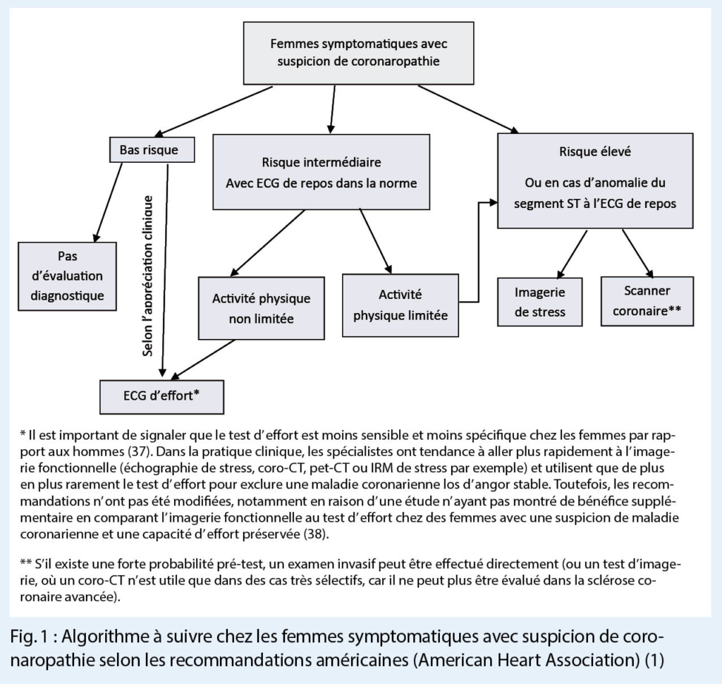 Les femmes préménopausées sont considérées comme ayant un risque bas (sauf en cas de diabète). Chez elles, aucune évaluation diagnostique n’ est indiquée. En cas de clinique inquiétante, l’ ECG d’ effort reste l’ examen le plus adapté. Les femmes ayants une cinquantaine d’ années sont considérées comme risque bas ou intermédiaire, selon leur limitation fonctionnelle pour les activités de la vie quotidienne. En cas de limitation fonctionnelle, elles doivent être considérées comme à risque intermédiaire. Les femmes ayants la soixantaine sont considérées comme risque intermédiaire. Si elles n’ ont pas de limitation pour une activité physique et elles ont un ECG de repos dans les limites de la norme, un ECG d’ effort est recommandé. En cas de limitation physique, elles doivent être testées comme en cas de risque élevé. Les femmes ayant la septantaine, ou présentant certaines comorbidité (p.ex diabète mal équilibré, artériopathie périphérique etc.) sont considérées comme à risque élevé, ainsi que les patientes avec un ECG de repos anormal (p.ex. élévation du segment ST) et doivent avoir une imagerie fonctionnelle ou un scanner coronarien, dont le choix doit être discuté avec un-e cardiologue (1, 34, 36).