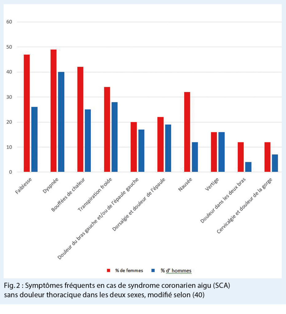 Plusieurs études ont démontré des différences hommes femmes dans les symptômes cliniques lors d’ un syndrome coronarien aigue (SCA). Par exemple, les femmes présentent plus souvent un angor instable et un IM sans élévation du segment ST (NSTEMI) sans douleur thoracique (39). La douleur reste toutefois le symptôme principal lors d’ un SCA, mais les femmes présentent plus souvent que les hommes des douleurs atypiques et des symptômes aspécifiques (40) (Fig. 2). Ce phénomène conduit à une fausse interprétation des plaintes et résulte une présentation plus tardive aux urgences (39).