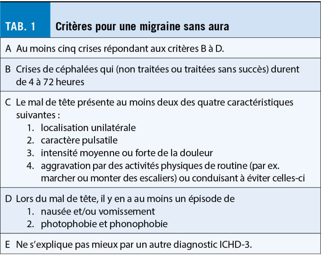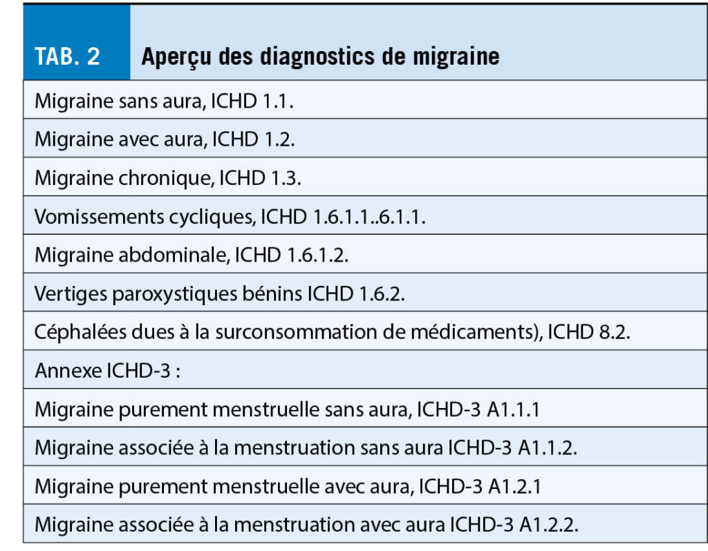 La clarification se fait de manière purement clinique par le biais du dialogue, du status neurologique et internistique, étant donné qu’ à ce jour il n’ existe pas de marqueurs de la migraine tels que les valeurs de laboratoire ou l’ imagerie spécifique. Pour les critères de diagnostic, la Classification internationale des troubles de la tête, ICHD-3 (tab. 1 et 2), est aujourd’ hui utilisée dans le monde entier. Comme pour le DSM, le site de l’ IHS (International Headache Society) offre plus de 200 types de maux de tête. La migraine étant également un diagnostic d’ exclusion, un examen IRM est aujourd’ hui indispensable. C’ est la seule façon de détecter les causes occultes et latentes des maux de tête secondaires. Une hémorragie sous-arachnoïdienne due à un anévrisme cérébral manqué est dans la plupart des cas une catastrophe évitable !