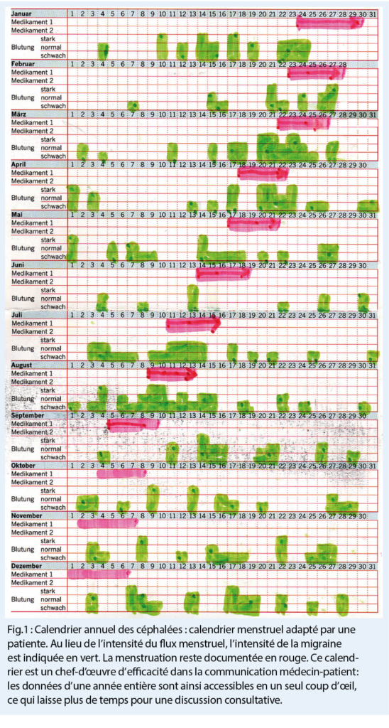 Environ 50 % des femmes migraineuses réagissent aux fluctuations hormonales du cycle mensuel normal, ce que l’ on peut visualiser au moyen d’ un simple calendrier combiné céphalées-menstruations (fig. 1). On y entre les jours de céphalées et de migraines ainsi que les jours de menstruation. Environ la moitié des personnes concernées souffrent de migraine quelques jours avant le début des saignements, l’ autre moitié en même temps que les menstruations. Seules quelques personnes signalent des migraines quelques jours après un saignement ou pendant l’ ovulation.