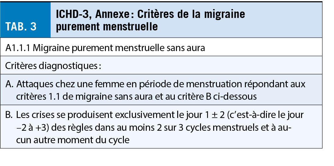 Les autres chapitres de l’ ICHD-3 comprennent les céphalées secondaires classées selon les causes, par ex. les céphalées post-traumatiques (chapitre 5, ICHD), mais aussi la migraine menstruelle lors de fluctuations hormonales ou la migraine causée par les contraceptifs oraux. Étant donné que la migraine provoque de graves souffrances, on parlera principalement de migraine dans la suite de l’ article (tab. 1 : classification ICHD des céphalées liées aux hormones). Cette distinction est importante pour les personnes concernées, car la migraine est non diagnostiquée à 50 % et donc sous-traitée à 50 % – malgré le « Dr Google ».