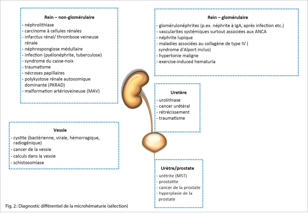 Le diagnostic différentiel de la microhématurie est large et va de l’ anodin à des maladies potentiellement mortelles. Les causes les plus fréquentes sont les infections des voies urinaires, la néphro-/urolithiase et – avec l’ âge- les tumeurs malignes de l’ appareil urogénital. En outre, toute forme de glomérulonéphrite peut provoquer une microhématurie. Les diagnostics différentiels de la microhématurie sont énumérés ci-dessous (fig. 2) (liste incomplète, certaines étiologies peuvent se manifester dans différentes localisations).