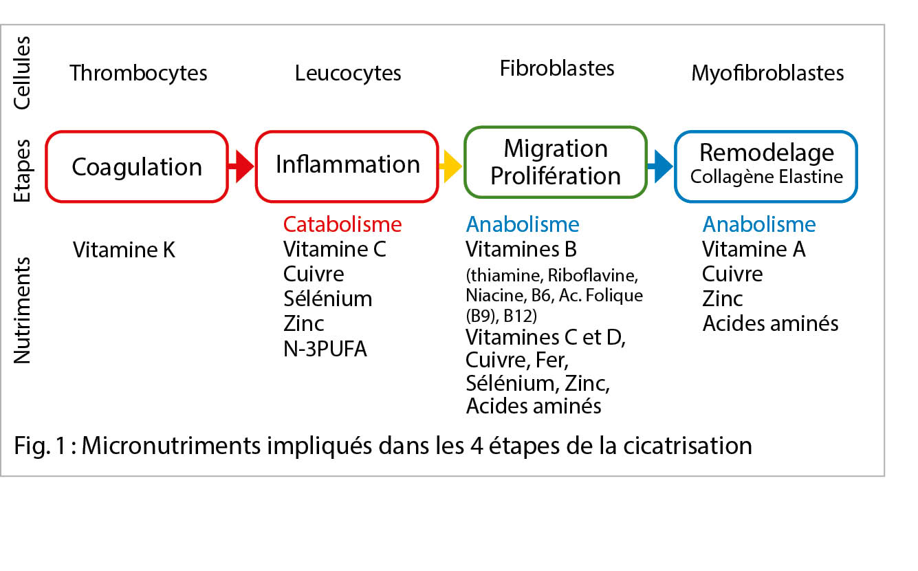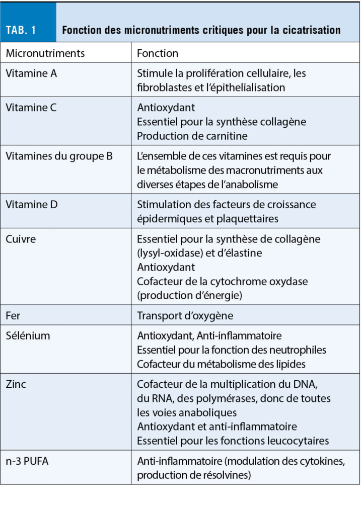Certains micronutriments sont particulièrement importants pour la cicatrisation (6), et leurs fonctions sont résumées dans le tableau 1. Les micronutriments liés à la cicatrisation le sont aussi à l’ immunité : un déficit en fer (Fe), vitamines C et D, en vitamines B6 (pyridoxine) et B12 (cobalamine), acide folique et zinc (Zn) compromettent les défenses immunitaires (7).