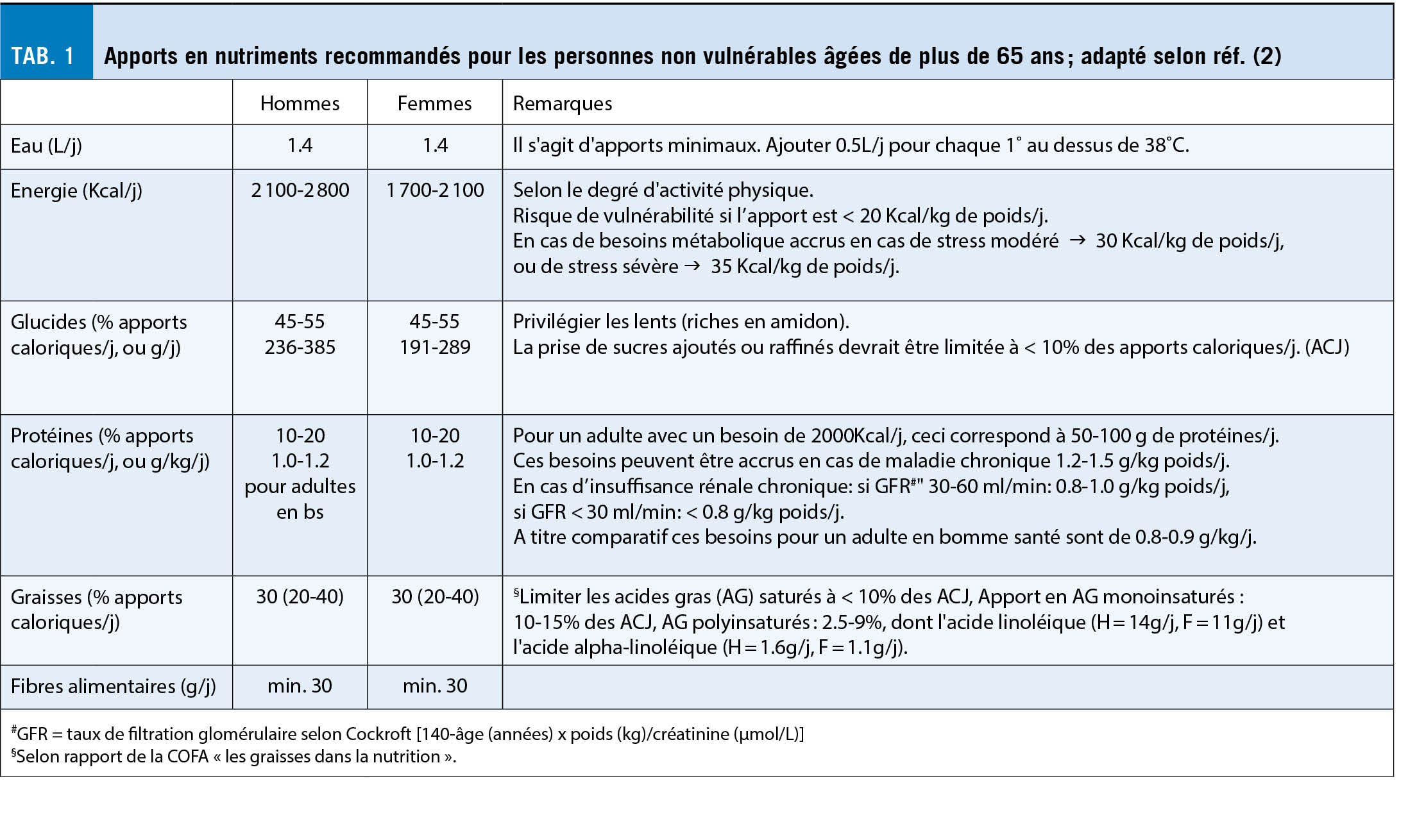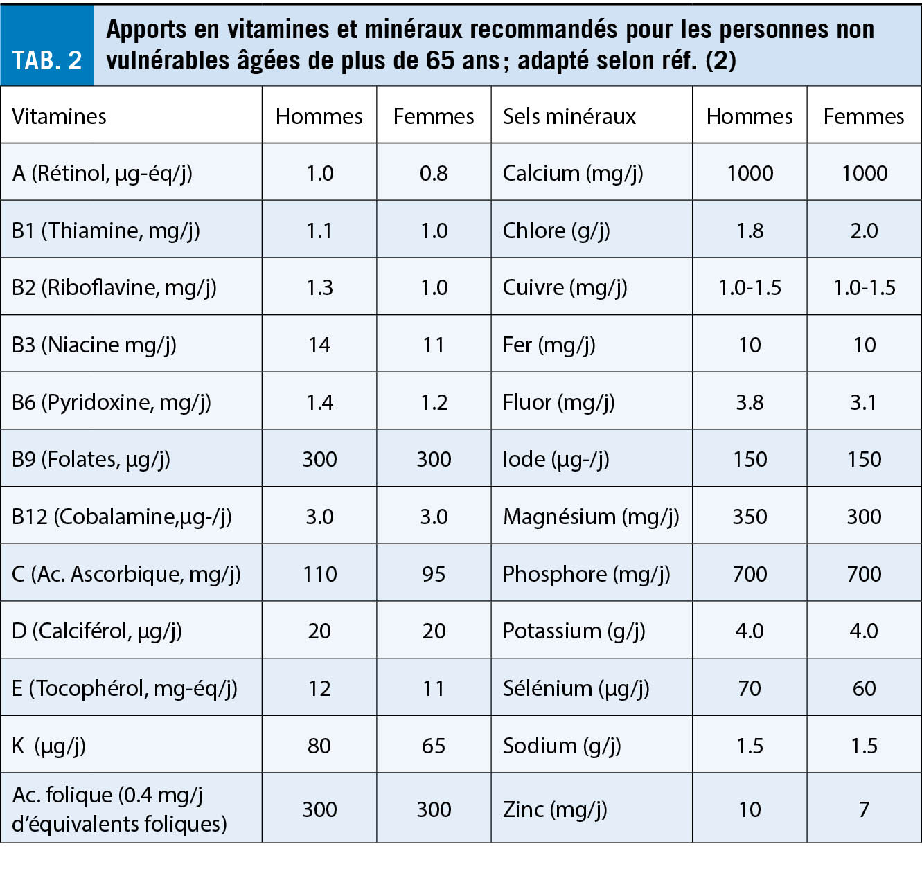 Les tableaux 1 et 2 résument les apports recommandés en nutriments, vitamines et minéraux, chez les personnes âgées non vulnérables. Il s’ agit-là d’ indicateurs qui, en complément avec la pyramide alimentaire, devraient faciliter la composition des repas visant à l’ équilibre alimentaire sur plusieurs jours.