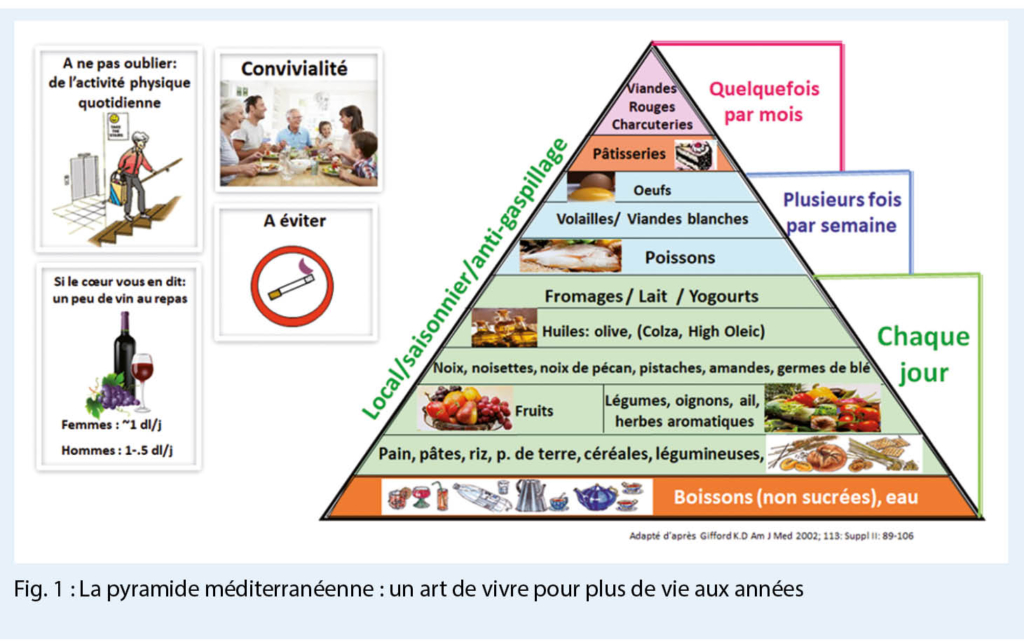 A titre d’ exemple, l’ adhérence à une diète de type méditerranéenne pour 2339 personnes âgées de 70 à 90 ans suivies pendant 10 ans a été associée à une réduction significative de la mortalité totale (-23%), coronarienne (-39%), cardiovasculaire (-29%) et d’autres causes (-39%), la baisse de la mortalité par cancers étant non significative (-10%) (6). Certes ces études comportent des limitations méthodologiques liées notamment à la saisie des habitudes alimentaires. Mais, la cohérence des résultats plaide en faveur d’ une telle diète qui peut être également applicable en Suisse à l’ aide de la pyramide méditerranéenne (fig. 1) et du tableau de son score d’ adhérence à cette diète (tab. 3).