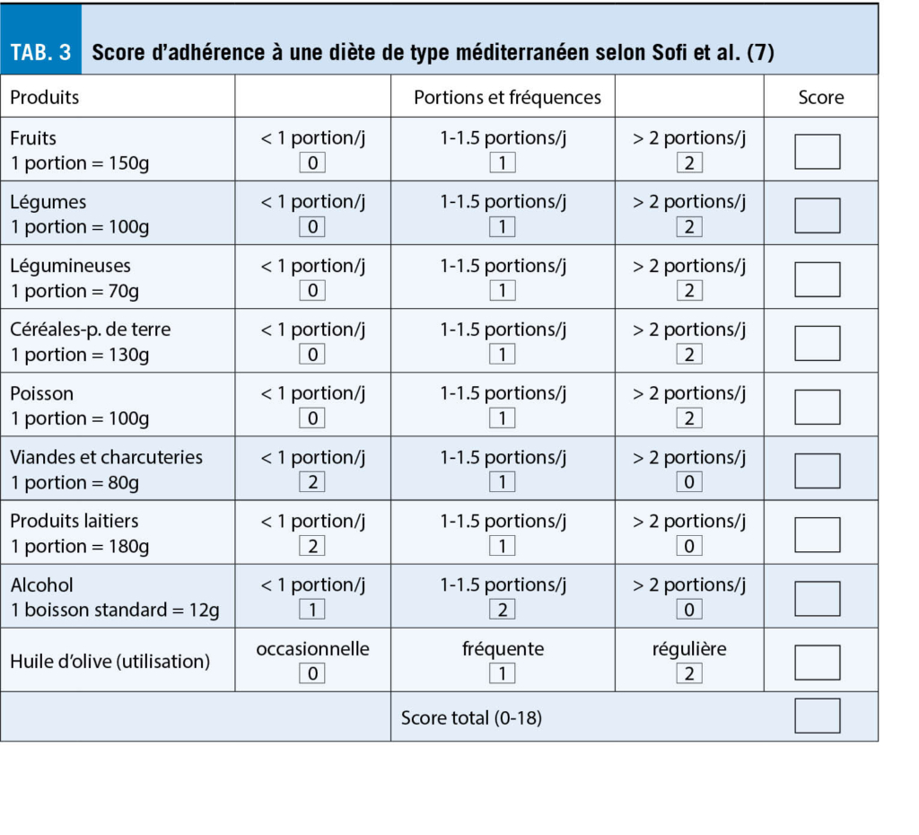 En bref, la pyramide méditerranéenne qui mentionne les fréquences de consommation des items alimentaires complète la pyramide suisse. S’ il existe de nombreux index ou scores d’ alimentation saine, celui présenté ici par F. Sofi et al. (tab. 3) a l’ avantage d’ être simple d’ utilisation et d’ avoir été établi sur un ensemble de 18 études prospectives réalisées en Europe, aux USA et en Australie. A noter que chaque incrément de 2 pts de ce score, oscillant en 0 et 18, est corrélé à une réduction de 9% de la mortalité totale, de 10% de la morbidité/mortalité cardiovasculaire et de 5% de la mortalité par cancer.