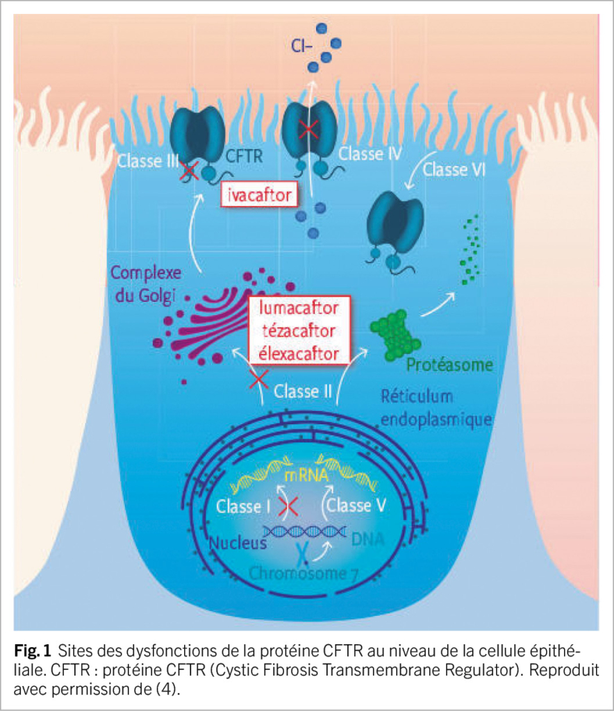La mucoviscidose est une maladie monogénique potentiellement grave, à transmission autosomique récessive, touchant plus de 100’ 000 personnes dans le monde (1, 2). Elle est due à des mutations sur le gène CFTR entraînant une altération de la synthèse ou de la fonction de la protéine CFTR (Cystic Fibrosis Transmembrane conductance Regulator, ci-après pCFTR). Depuis la découverte initiale de la mutation la plus courante (F508del), plus de 2000 variants du gène CFTR ont été décrits (1, 2), dont environ 400 sont considérés associés à la mucoviscidose. Ils sont répertoriés dans les classes I à VI, en fonction des de leur impact sur la production et la fonction de la pCFTR (1, 2). La pCFTR est un canal transmembranaire de chlorure qui se trouve sur la face apicale des épithéliums sécrétoires, plus particulièrement les glandes sudoripares, les voies respiratoires, le tractus gastro-intestinal, le pancréas et les canaux déférents (1, 2). Elle régule l’ équilibre en sel et en eau à la surface des cellules et un dysfonctionnement de cette protéine résulte en des sécrétions et mucus visqueux. Les manifestations cliniques de la maladie sont multisystémiques et se déclarent à des âges variables selon le dysfonctionnement de la pCFTR (3, 4). Au niveau pulmonaire, la mucoviscidose est caractérisée par un trouble sévère de la clairance mucociliaire, une inflammation et une colonisation bactérienne chronique des voies respiratoires supérieures et inférieures, se compliquant de bronchectasies et d’ un déclin progressif de la fonction pulmonaire. L’ insuffisance pancréatique exocrine, avec malabsorption des lipides et des vitamines liposolubles, est très fréquente, ainsi que la constipation. Le diabète lié à la mucoviscidose concerne 30 % des patients de plus de 18 ans et sa prévalence augmente avec l’ âge, alors que la cirrhose biliaire est beaucoup plus rare (3, 4). La prise en charge de la mucoviscidose a longtemps reposé sur un traitement symptomatique contraignant, mais qui a prolongé considérablement l’ espérance de vie des patients. Depuis les années 2010, une nouvelle classe de médicaments est disponible, les modulateurs de la pCFTR permettant de restaurer l’ activité de celle-ci (1).