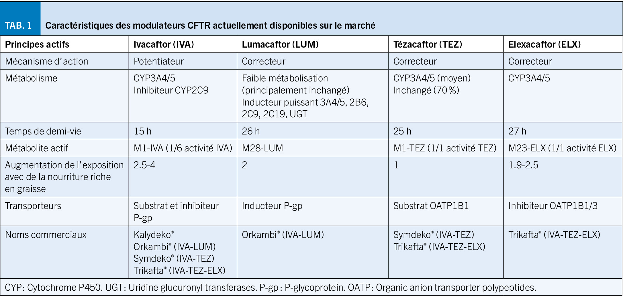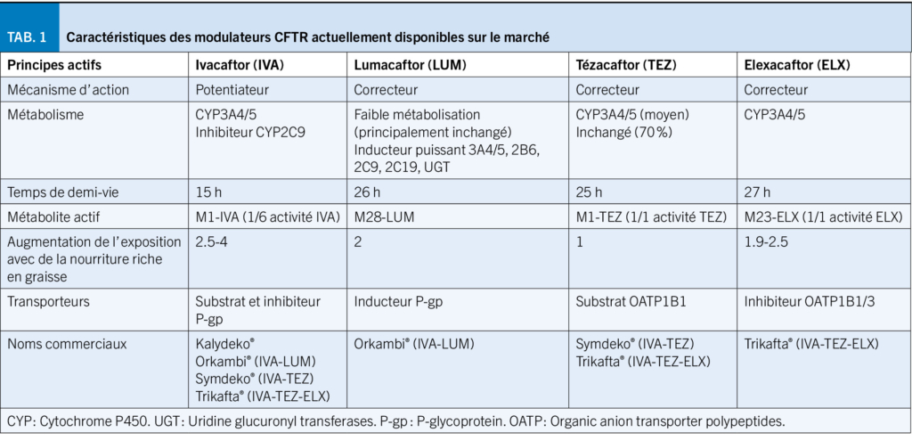 Les modulateurs de la pCFTR sont éliminés majoritairement par les cytochromes (CYP) 3A4/5 (Tableau 1) et l’ ivacaftor et l’ élexacaftor peuvent aussi être substrats, inhibiteurs ou inducteurs des P-gp et/ou des OATP1B1/3. De ce fait, ils présentent un risque important d’ interactions médicamenteuses, en particulier avec les inducteurs ou les inhibiteurs des CYP3A4/5. Une diminution marquée de l’ exposition (89 %) et une augmentation de 15 fois des concentrations d’ ivacaftor en co-administration avec la rifampicine et l’ itraconazole, respectivement, ont été observées (11). Des modifications plus faibles toutefois significatives sont attendues avec les inhibiteurs ou inducteurs modérés des CYP3A4/5 (p.ex. rifabutine ou fluconazole). Bien qu’ aucune interaction médicamenteuse entre le Trikafta® et les inducteurs de l’ OATP1B1/3 n’ ait été rapportée, le gemfibrozil et la ciclosporine, inhibiteurs de l’ OATP1B1/3, pourraient théoriquement entraîner une augmentation des concentrations sériques de Trikafta® (12). A noter également que l’ ivacaftor, inhibiteur des CYP2C9, peut augmenter l’ effet de certains médicaments substrat de cette enzyme (acénocoumarol, glibenclamide) et une prudence et une surveillance adaptée est préconisée en cas d’ administration de médicaments substrats des OATP1B1 tels que les statines, le glibenclamide ou le répaglinide. La bilirubine étant un substrat d’ OATP1B1 et d’ OATP1B3, de légères augmentations du taux moyen de bilirubine totale peuvent survenir (10, 11).