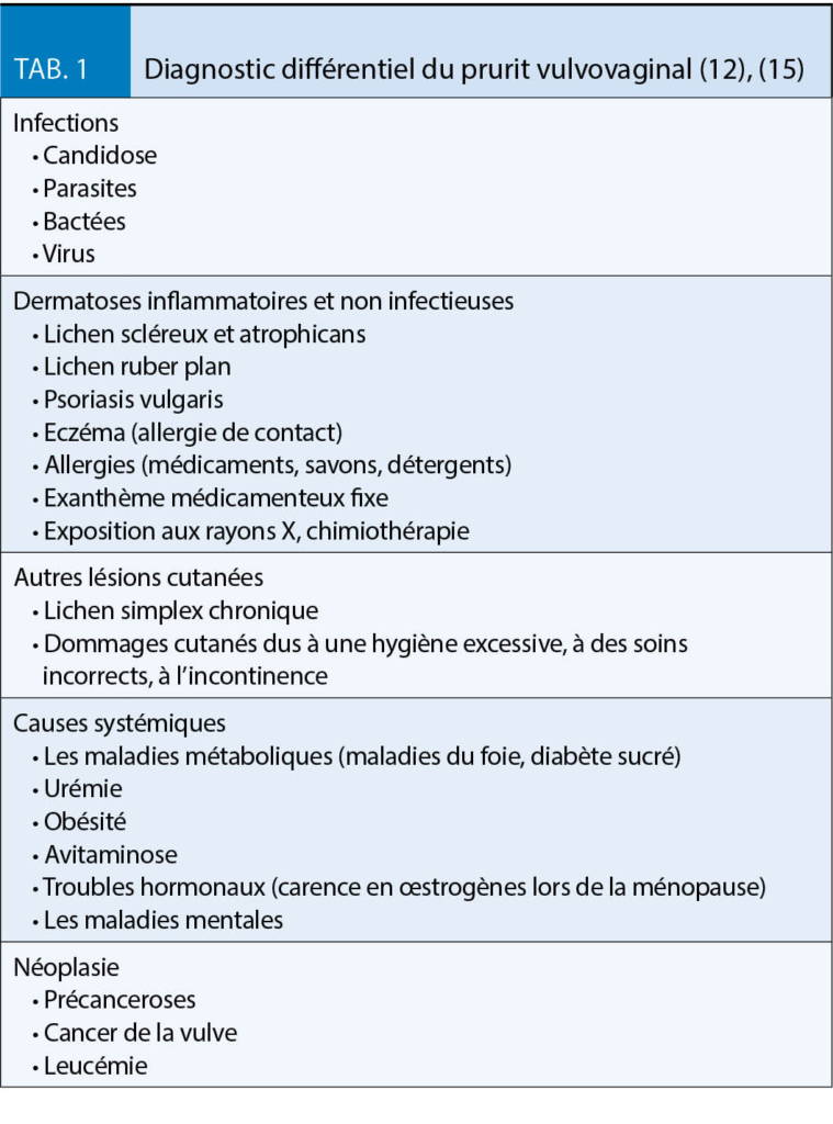 Le prurit vulvaire ou vaginal est un symptôme majeur courant en gynécologie, en gynécologie de l’ enfant et de l’ adolescent c’ est même le symptôme le plus courant avec plus de 60 % (1). La liste des causes possibles est longue et ce n’ est pas toujours une infection fongique qui en est responsable. Moins de 50 % des femmes ayant un prurit vulvaire ou vaginal souffrent en fait de candidose vulvovaginale. Cependant, en présence de cette dernière, le prurit est le symptôme cardinal qui, dans 90 % des cas, est associé à une candidose vulvo-vaginale (2). En cas de prurit génital, le diagnostic différentiel doit prendre en compte les allergies, les irritations cutanées (produits de soin et d’ hygiène, etc.), les infections de la vulve et/ou du vagin, les maladies internes (par exemple diabète sucré, polyarthrite rhumatoïde, lupus érythémateux disséminé), l’ atrophie génitale (carence en œstrogènes), les néoplasies, les maladies cutanées chroniques non infectieuses (par exemple lichen scléreux) ou une genèse psychologique (3). Un aperçu des diagnostics différentiels est donné au tableau 1. Le traitement est généralement basé sur la maladie sous-jacente ou, si aucune cause spécifique ne peut être trouvée, il peut être pour une période temporaire de nature purement symptomatique (par exemple, corticostéroïdes locaux, lotion de lavage au pH neutre, crème grasse).