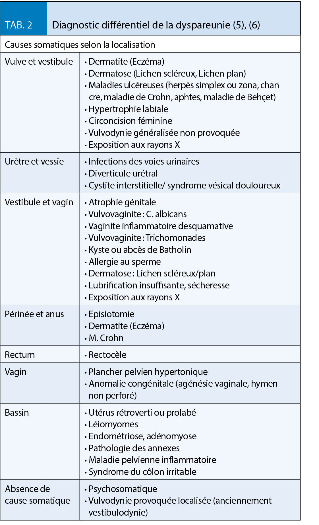 La dyspareunie, le rapport sexuel douloureux, touche environ 8-22 % de toutes les femmes (4). Il faut distinguer la dyspareunie superficielle (souvent près de l’ introïtus, lors de la pénétration) de la dyspareunie profonde. Les causes les plus courantes de dyspareunie chez les femmes de moins de 50 ans sont la dermatose vulvaire, l’ endométriose, le syndrome de douleur vulvaire provoquée, le syndrome de douleur pelvienne myofasciale (myofacial pelvic pain syndrome) et la cystite interstitielle / le syndrome vésical douloureux (painful bladder syndrome). L’ atrophie urogénitale est la cause la plus fréquente chez les femmes de plus de 50 ans (5), (6). Le tableau 2 donne un aperçu des diagnostics différentiels les plus importants.