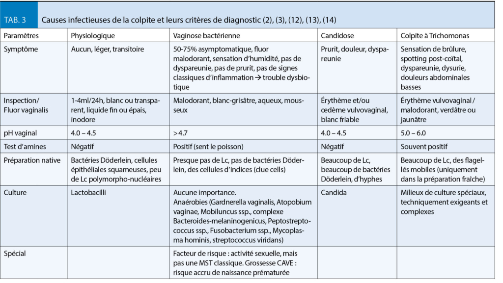 Les causes les plus courantes sont de nature infectieuse. Les trois causes infectieuses les plus courantes, la vaginose bactérienne, la vulvovaginite à candida et la trichomonase, représentent ensemble environ 90 % des infections (9) (tableau 3). Les causes non infectieuses de la vaginite comprennent l’ atrophie vaginale, les corps étrangers (restes de tampon ou de préservatif), les allergènes et les irritants et d’ autres entités moins courantes comme les maladies systémiques.