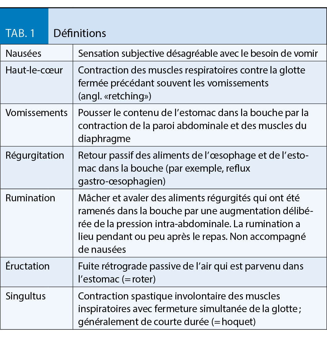 Les vomissements stimulent souvent le système nerveux sympathique et parasympathique, ce qui peut entraîner des symptômes tels que sueurs froides, tachycardie, dilatation des pupilles ou hypotension. Il convient de distinguer la régurgitation des vomissements proprement dits. Ce phénomène n’ est généralement pas associé à des nausées et est souvent causé par un sphincter inférieur de l’ œsophage insuffisant ou par une sténose de l’ œsophage. La rumination signifie à son tour un transport rétrograde du contenu de l’ estomac (généralement sans nausées), par exemple chez les patients souffrant de troubles psychosomatiques. Les éructations (rots) et les hoquets sont des formes d’ expulsions d’ air (tab. 1).