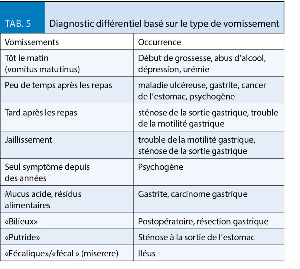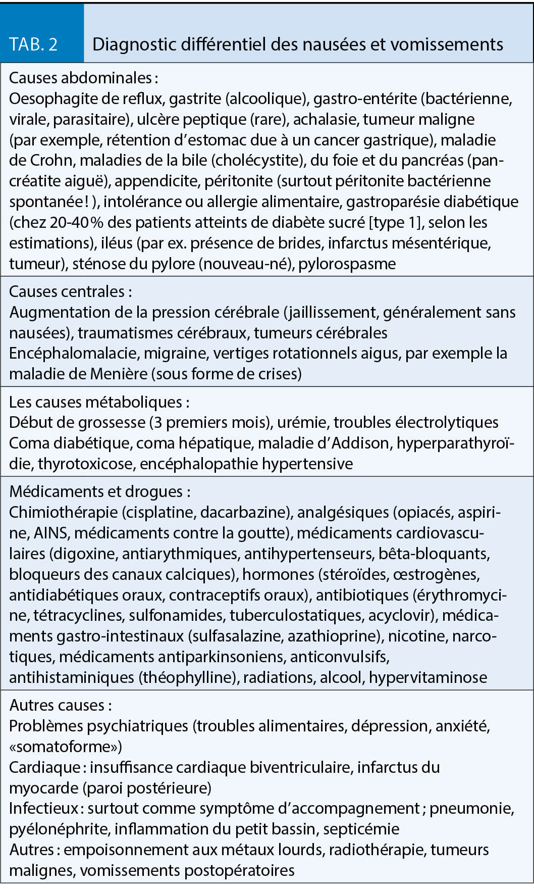 Le diagnostic différentiel des nausées et des vomissements est donné dans le tableau 2. L’ augmentation de la pression intracrânienne due à des tumeurs, à des saignements ou à une obstruction de l’ écoulement du liquide céphalorachidien provoque une explosion soudaine de vomissements qui se produit généralement sans nausées. L’ irritation du labyrinthe entraîne des nausées et des vomissements lors du mal des transports, de la maladie de Ménière et des vertiges positionnels paroxystiques bénins. L’ obstruction gastrique peut être due à des causes malignes ou peptiques et, comme les obstructions de l’ intestin grêle et du gros intestin (par exemple à la suite d’ adhérences, de tumeurs, de volvulus, d’ invaginations ou dans la maladie de Crohn), elle peut entraîner des nausées et des vomissements. On estime que 20 à 40 % des patients atteints de diabète sucré de type 1 développent une gastroparésie diabétique avec des nausées et des vomissements consécutifs. Cependant, une gastroparésie peut également se produire après une vagotomie, un carcinome du pancréas, une sclérodermie et une amyloïdose. Les vomissements en cas de pancréatite, cholécystite et appendicite sont causés par une irritation viscérale locale et un trouble de la motilité. Le syndrome de l’ artère mésentérique supérieure ou syndrome de la pince aorto-mésentérique est un tableau clinique rare caractérisé par des vomissements postprandiaux et une perte de poids. Sur le plan pathogénique, il s’ agit d’ un rétrécissement du duodénum distal entre l’ aorte et l’ artère mésentérique supérieure, causé par un angle extrêmement aigu de l’ artère mésentérique supérieure. Le syndrome se manifeste principalement chez les patients alités et cachectiques en position couchée, accompagné d’ une douleur de type crampe au milieu de l’ abdomen supérieur, qui s’ améliore de façon caractéristique après le passage à la position coude-genou. Les vomissements aigus dans les intoxications alimentaires sont dus à Staphylococcus aureus et à Bacillus cereus. La grossesse est la cause endocrinienne la plus fréquente de vomissements. Jusqu’ à 70 % des femmes en souffrent au cours du premier trimestre. L’ hyperémèse gravidique est une forme grave de vomissement pendant la grossesse, qui peut entraîner une perte considérable de liquide et des troubles électrolytiques. Parmi les autres causes métaboliques de vomissements figurent l’ urémie, l’ acidocétose, l’ insuffisance surrénalienne ainsi que les troubles thyroïdiens et parathyroïdiens. Les médicaments sont probablement la cause la plus fréquente des vomissements. En principe, toutes les médicaments peuvent provoquer des nausées et des vomissements. Les plus courants sont les antibiotiques, les antiarythmiques, les antihypertenseurs, les antidiabétiques oraux, les contraceptifs et les médicaments chimiothérapeutiques (en particulier le cisplatine). La radiothérapie abdominale entraîne une perturbation de la fonction motrice et la formation de sténoses. Les toxines présentes dans le sang entraînent une stimulation de l’ area postrema ou aire du vomissement (par exemple une intoxication alcoolique). L’ insuffisance hépatique produit également des toxines endogènes qui provoquent des vomissements. Les causes cardiaques telles que l’ infarctus aigu du myocarde, en particulier de la paroi postérieure, et l’ insuffisance cardiaque biventriculaire peuvent entraîner des nausées et des vomissements. Les vomissements postopératoires surviennent dans près de 25 % des opérations et sont particulièrement fréquents après des laparotomies, des procédures orthopédiques et chez les femmes. Les patients souffrant de troubles psychiatriques tels que les troubles alimentaires, les troubles anxieux et la dépression font souvent état de nausées graves avec retard de vidange gastrique et de vomissements (tab. 2).