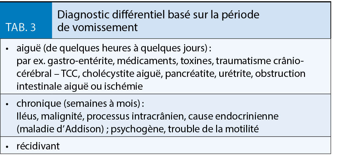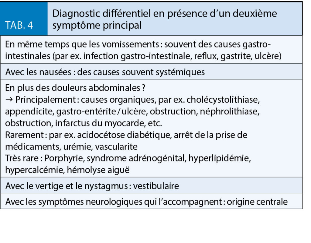 Les diagnostics différentiels basés sur la période de vomissement sont résumés dans le tableau 3, ceux en présence d’ un deuxième symptôme principal dans le tableau 4 et ceux basés sur le type de vomissement dans le tableau 5.