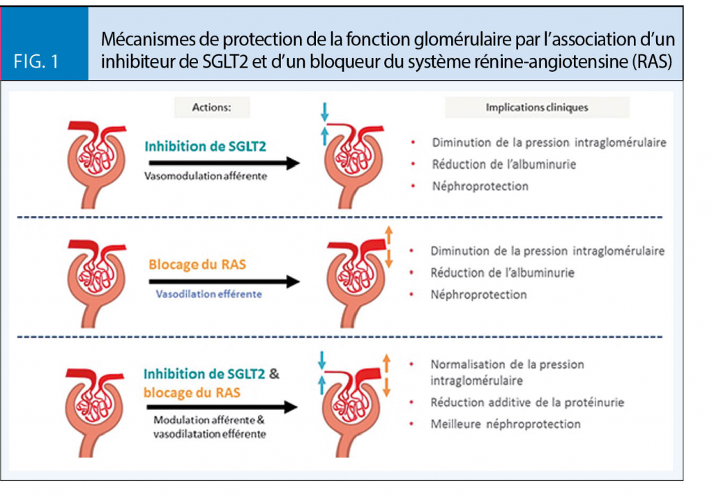 La protection rénale constitue aujourd’ hui un aspect très important de la prise en charge des patients diabétiques car l’ insuffisance rénale augmente considérablement le risque de mortalité dans cette population. Les bloqueurs du système rénine-angiotensine associés aux mesures diététiques et au contrôle de la glycémie sont les piliers de la néphroprotection. Toutefois, les résultats récents obtenus avec les inhibiteurs de SGLT2 démontrent que l’ on peut améliorer la néphroprotection de manière significative en les combinant avec le traitement standard actuel. L’ association d’ un bloqueur du système rénine-angiotensine avec un inhibiteur de SGLT2 devrait devenir le traitement de choix pour prévenir la progression de la néphropathie diabétique.